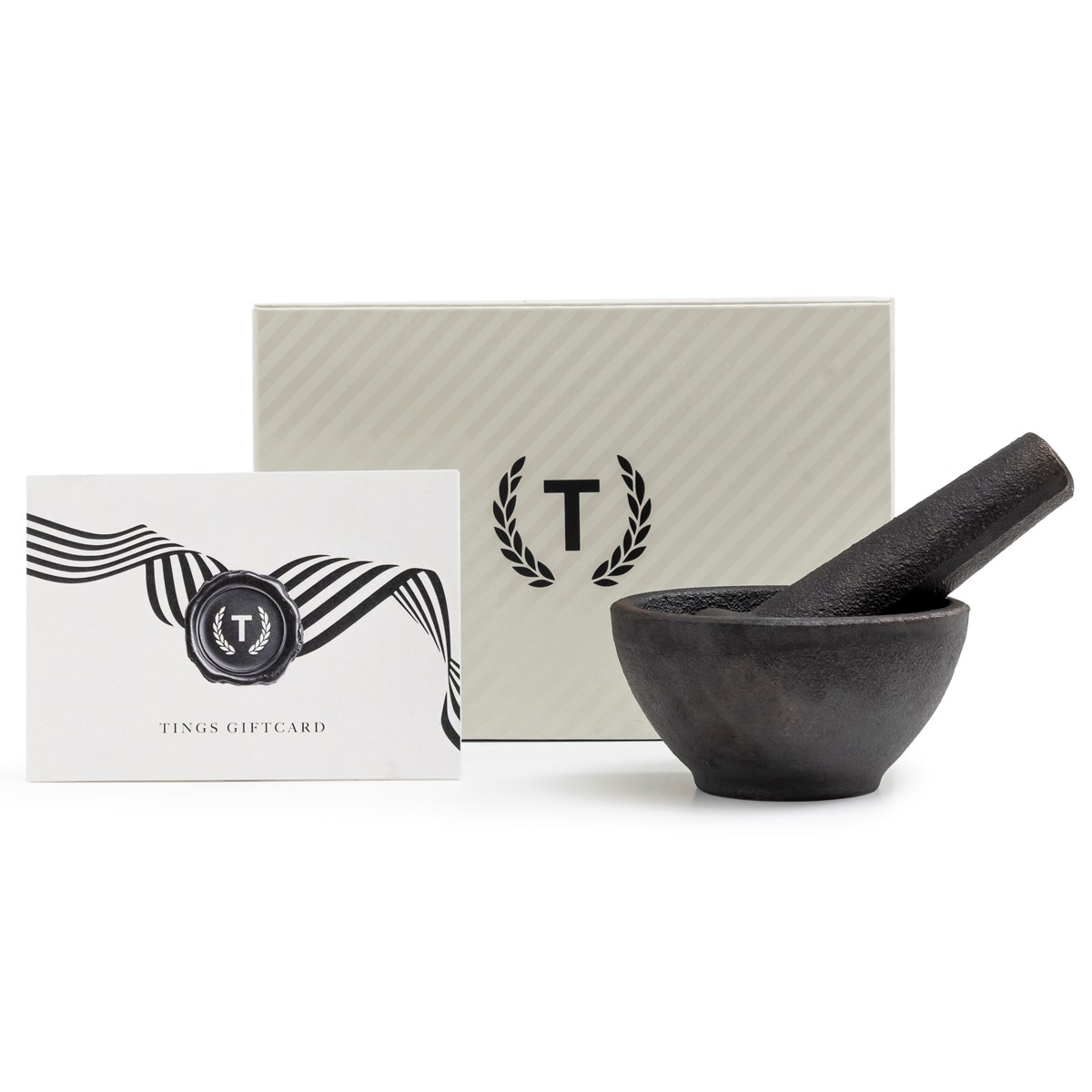 Tings Giftcard med en mortel i gjutjärn som premie/extragåva. Morteln är 8,5 cm i diameter och 4,5 cm hög. Morteln kommer förpackad tillsammans med julkort och gåvokort i en elegant box.