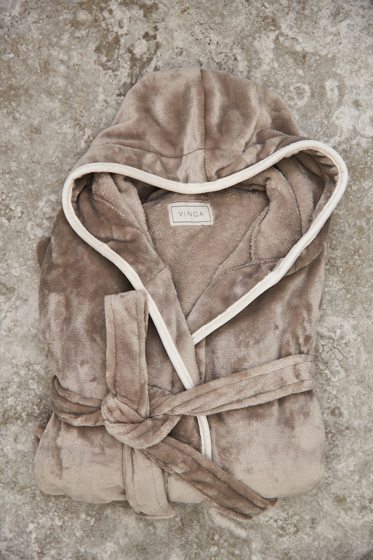 Mysig och mjuk morgonrock i luxury plush med stor huva och dekorativ piping. Två fickor framtill och skärp i midjan. Tillverkad av 70 % återvunnet material från PET-flaskor. OEKO-TEX Standard 100.