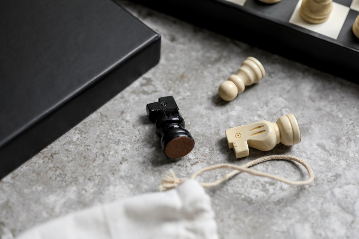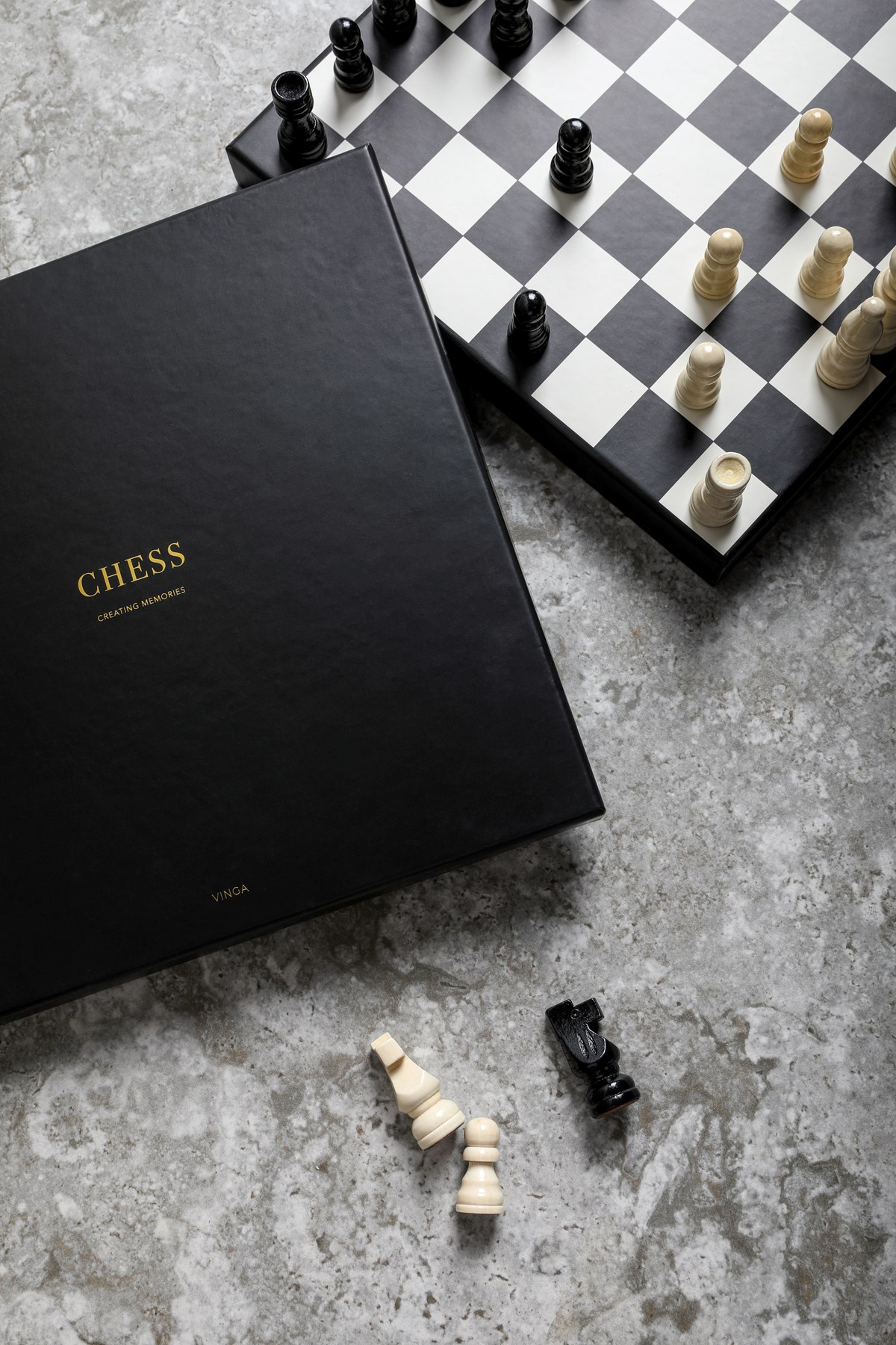 Klassiskt schackspel. Pjäserna är lackerade i trä. Spelet kommer i en fin förvaringslåda. Mått: 25 x 25 cm.