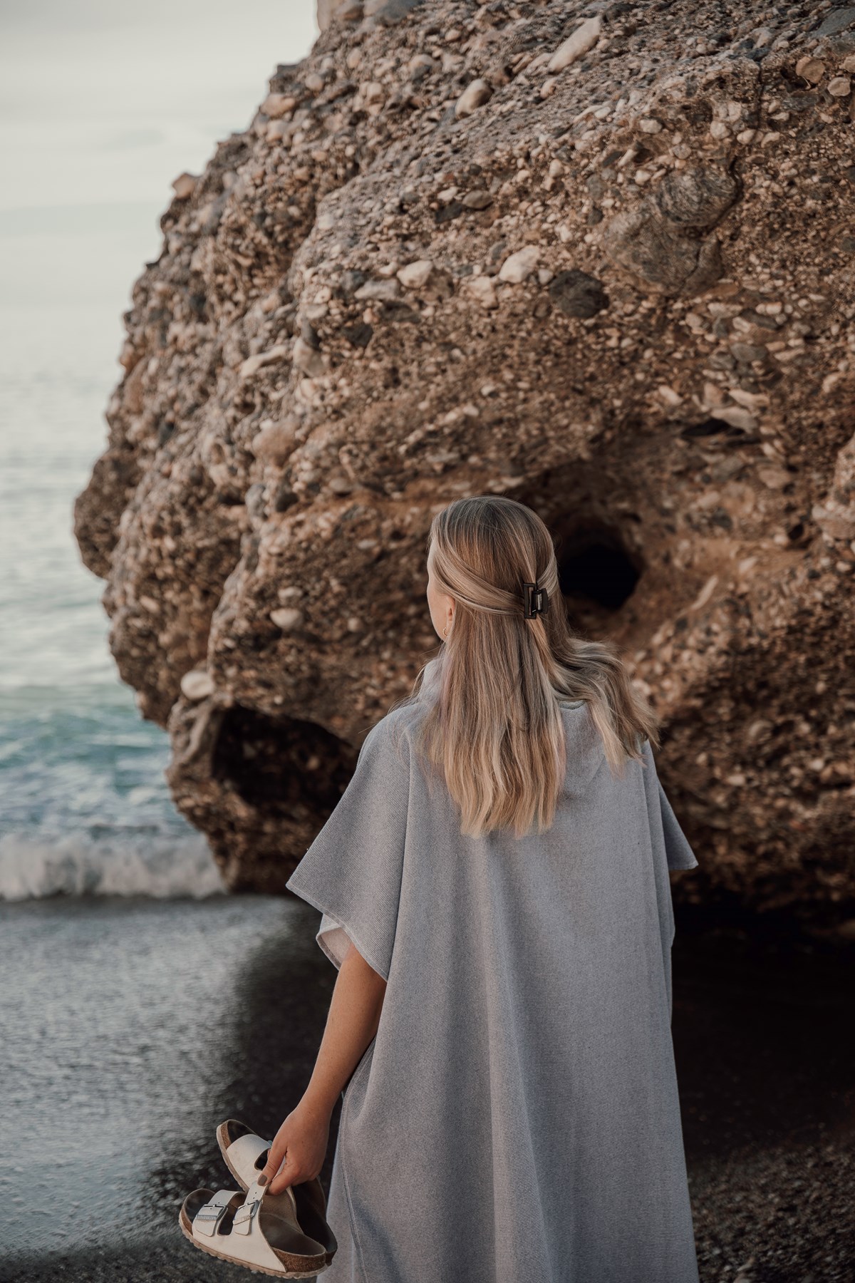 Hamam poncho designad med två olika typer av textur, den ena sidan i frotté och andra sidan slät. Ponchon är ett praktiskt och mångsidigt plagg som är perfekt att bära på stranden eller vid poolen och har en utmärkt absorberingsförmåga och är snabbtorkande. Den är tillverkad av 75% bomull, 25% polyester och med en tjocklek på 360 g/m2. Mått 100x95 cm. OEKO-TEX® STANDARD 100. 09.HIN.68091. Hohenstein HTTI.