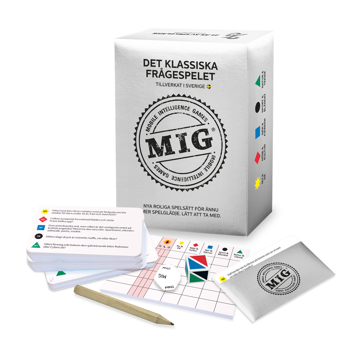 MIG klassiska frågespel i jubileumsupplaga. Spela på klassiskt vis eller med det nya roliga spelsättet där du kan få extra hjälp om du behöver. Med ”Räddaren i nöden” kan du ringa en kompis, söka snabbt på internet eller svara två gånger. I pubquiz-varianten används den nya spelkortsfickan och alla svarar på samma frågor. Spelet är lätt att ta med och innehåller aktuella frågor blandat med klassisk allmänbildning.