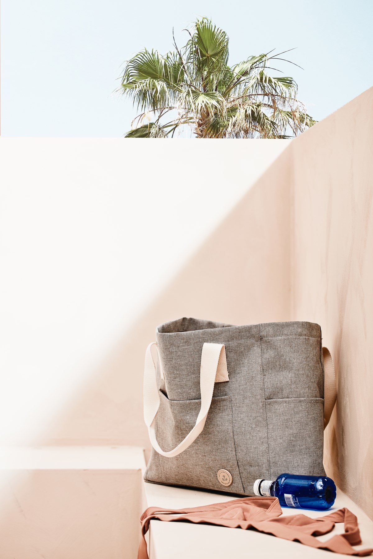Stilren strandväska försedd med praktiska dubbla bärhandtag. Strandväskan är rymlig och har smarta fack. Detta i form av ett mindre fack på insidan med dragkedja som lämpar sig för värdesaker, och tre mindre fack på utsidan som kan förvara sådant som kräver enkel tillgång. Mått: 45 x 15 x 35 cm.