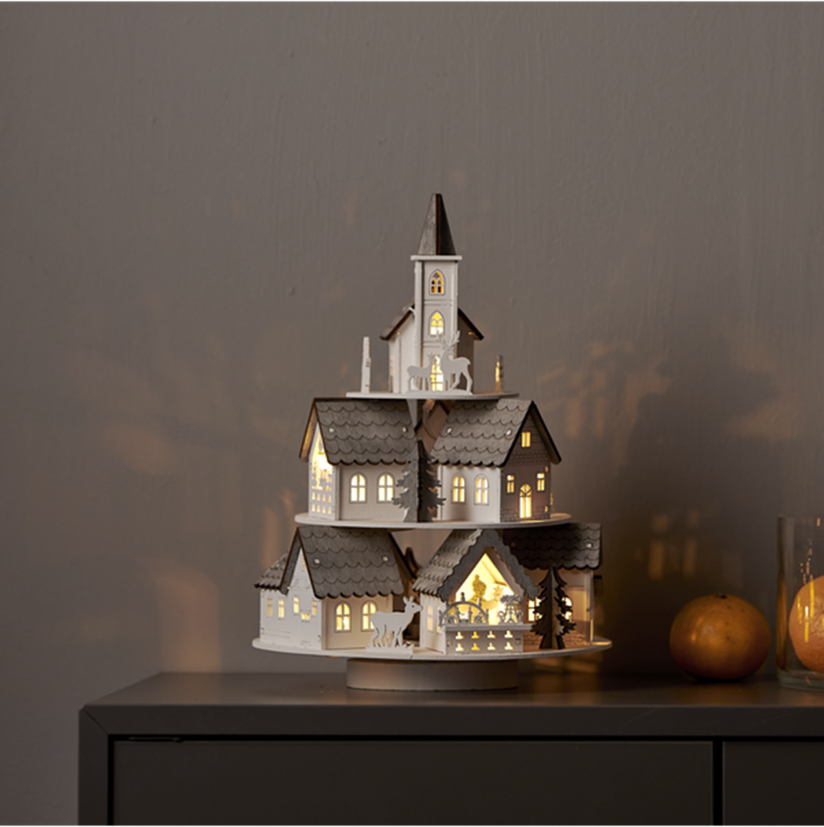 Detaljrik laserskuren dekoration i trä, tre våningar med vackert utskuret lanskap och små hus som lyser vackert när produkten är påslagen. Vrid på basen och dekorationen roterar och spelar en vacker melodi. Dekorera till advent och jul, placera ljusstaken i ett fönster eller på en byrå för att få den perfekta julkänslan. Drivs med 2 st AAA-batterier (ingår ej). Timer 6 timmar på, 18 timmar av, repeterande. 9 st LED ljusskällor.