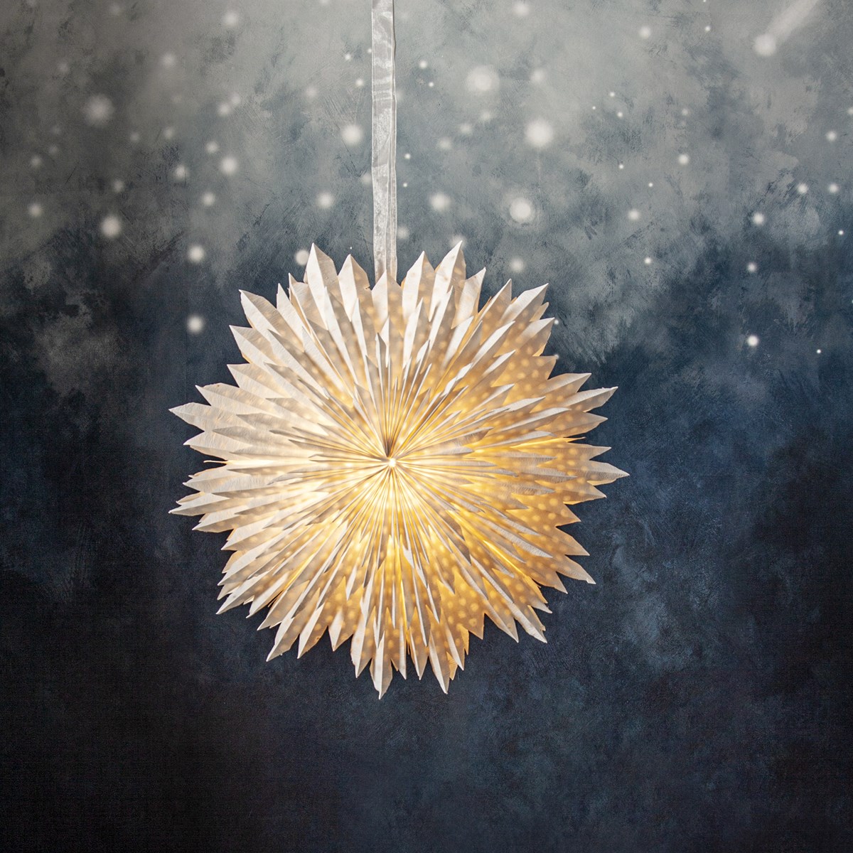 Magisk pappersstjärna som är tillverkad av tre lager veckat papper. Pappret är tillverkat av återvunnen bomullsspill från t-shirt tillverkning. Strukturen i pappret blir därför mjukt och i själva pappret ser man vattenstämplade prickar. Konturen är lite ojämn för en vintrigare känsla. Ett elegant band ingår för att lättare kunna hänga upp stjärnan. Stjärnan sprider stämning och ger hemmet den där speciella advent och julkänslan. Kan hängas både i förnster och mot en vägg.