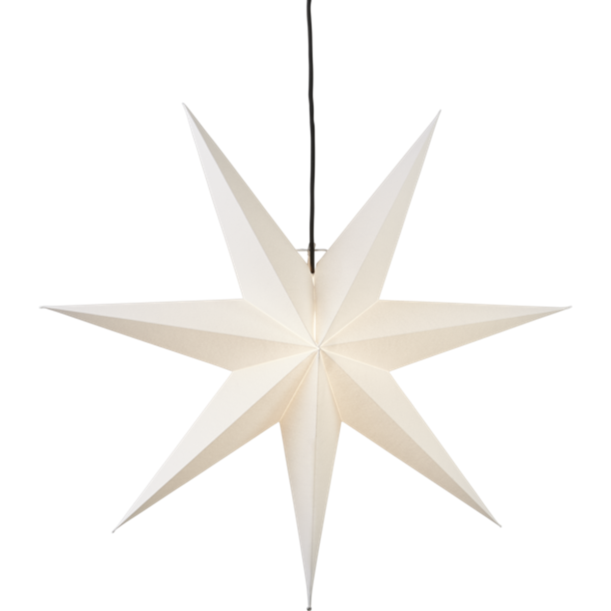 Vit pappersstjärna med svart textilkabel. Elegant stjärna att dekorera med i fönstret. Stjärnan har plats för en ljuskälla. Sockel E14. Höjden är 70 cm.