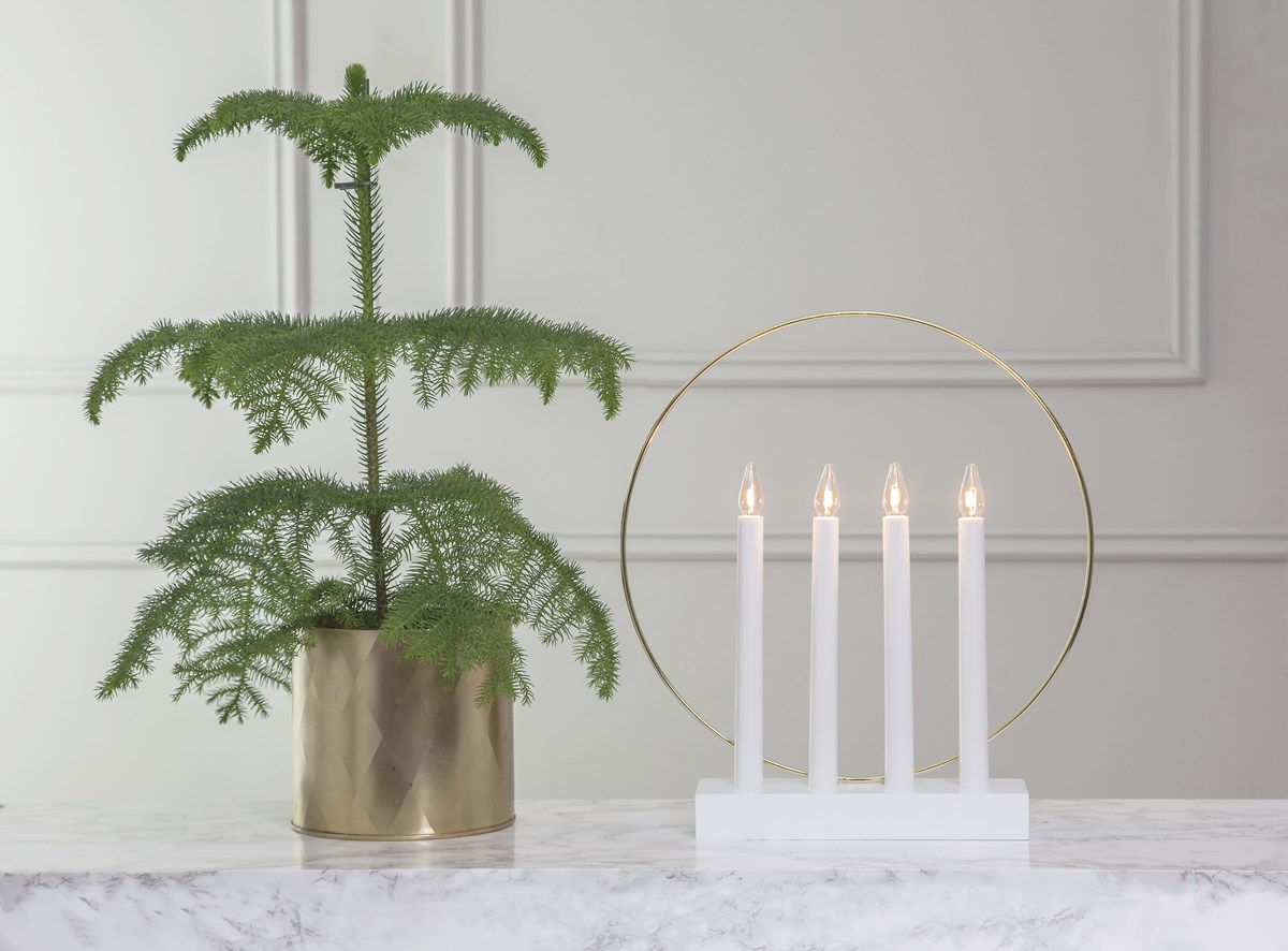 Stilren ljusstake i vitt med en dekorativ ring i mässing. 4 ljus som skapar en mysig stämning i ett fönster eller på en skänk. Höjd 35 cm, bredd 32 cm.