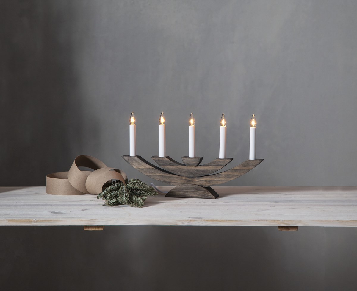 En elegant träljusstake med 5 ljus. Placera adventsljusstaken i ett fönster eller på en skänk. Skapar en härlig julstämning i både hem och offentlig miljö. BxH: 42x24 cm.