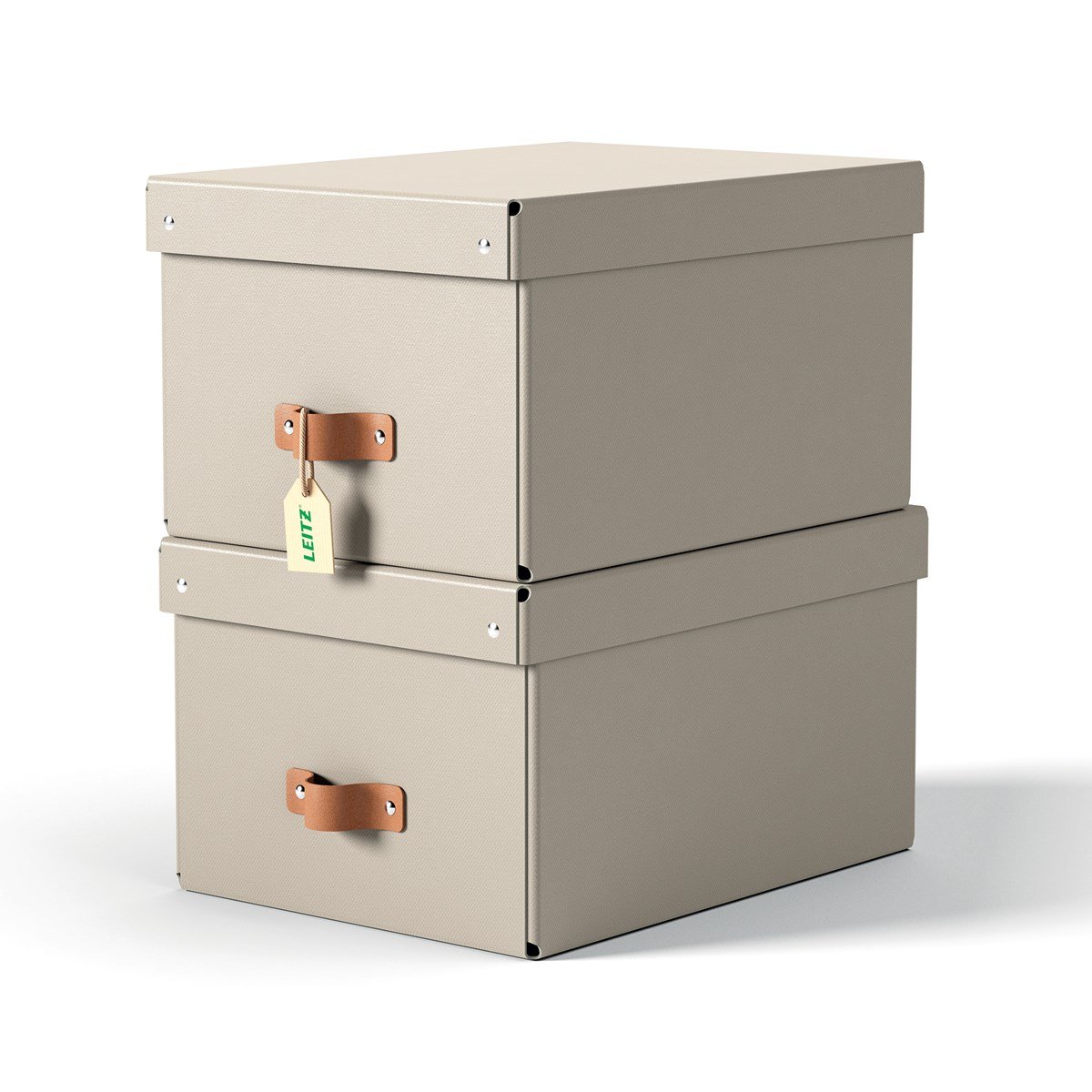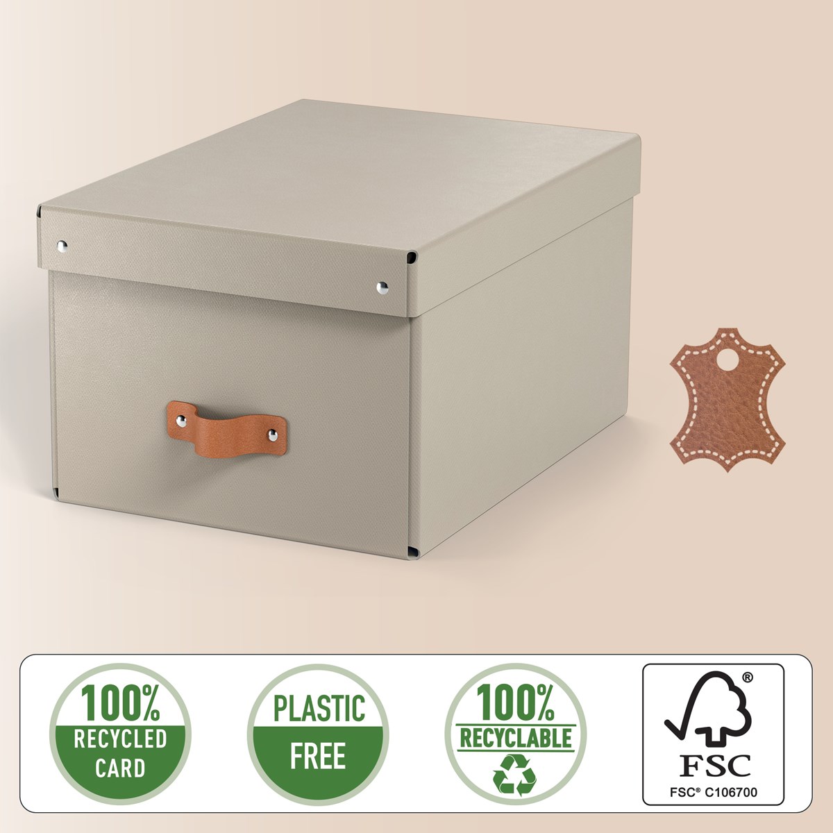 Leitz hyllförvaringsboxar levereras flatpackade och är snabba och enkla att montera utan verktyg. Dessa stapelbara förvaringslådor är skonsamma mot planeten och tillverkade av 100 % återvunnen FSC-certifierad kartong och kan demonteras helt för 100 % återvinning efter användning.urvalet av jordnära färger - inspirerade av naturens renhet och enkelhet - passar perfekt till din inredning och ger en känsla av lugn i dina rum och på kontoret. Varje förvaringslåda har ett draghandtag i läder som gör dem lätta att ta fram från hyllor och förvaringsenheter. Tillverkad i Italien.