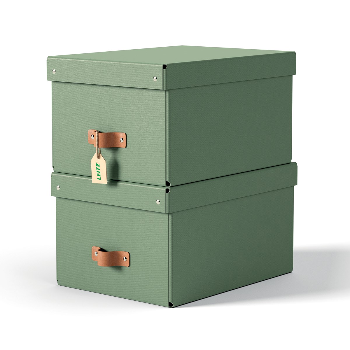 Leitz hyllförvaringsboxar levereras flatpackade och är snabba och enkla att montera utan verktyg. Dessa stapelbara förvaringslådor är skonsamma mot planeten och tillverkade av 100 % återvunnen FSC-certifierad kartong och kan demonteras helt för 100 % återvinning efter användning.urvalet av jordnära färger - inspirerade av naturens renhet och enkelhet - passar perfekt till din inredning och ger en känsla av lugn i dina rum och på kontoret. Varje förvaringslåda har ett draghandtag i läder som gör dem lätta att ta fram från hyllor och förvaringsenheter. Tillverkad i Italien.