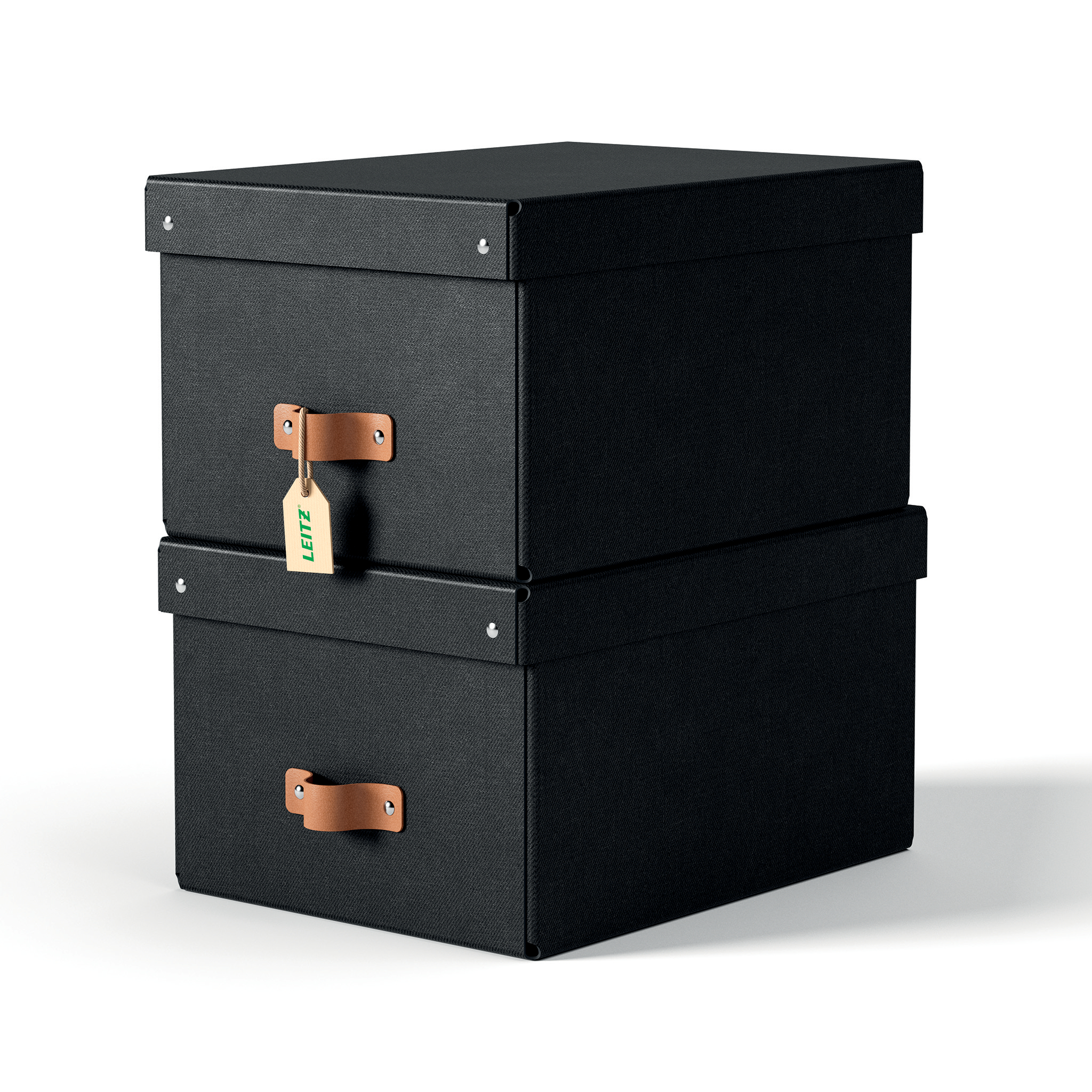 Leitz förvaringsboxar levereras flatpackade och är snabba och enkla att montera utan verktyg. Dessa stapelbara förvaringslådor är skonsamma mot planeten, tillverkade av 100 % återvunnen FSC-certifierad kartong och kan demonteras helt för 100 % återvinning efter användning.