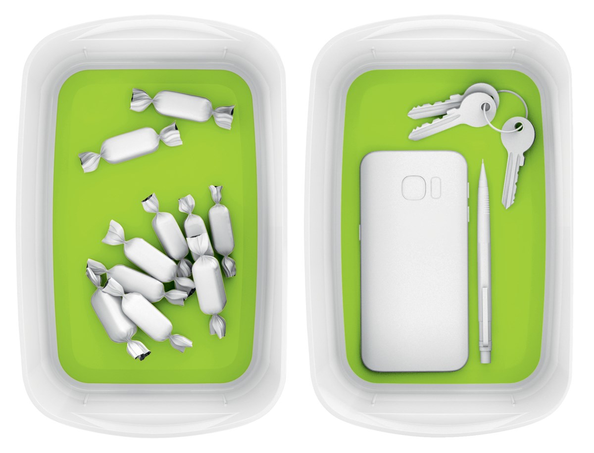 Elegant sorteringsfack i två färger för snabb och enkel organisering och smart förvaring. Tillverkad av robust, reptåligt och vattentätt plastmaterial för en förstklassig finish. Livsmedelssäker. Fri från BPA. När du inte använder kan facken kan de staplas inuti varandra för att spara utrymme. Lätta att rengöra, med mjuka rundade hörn.