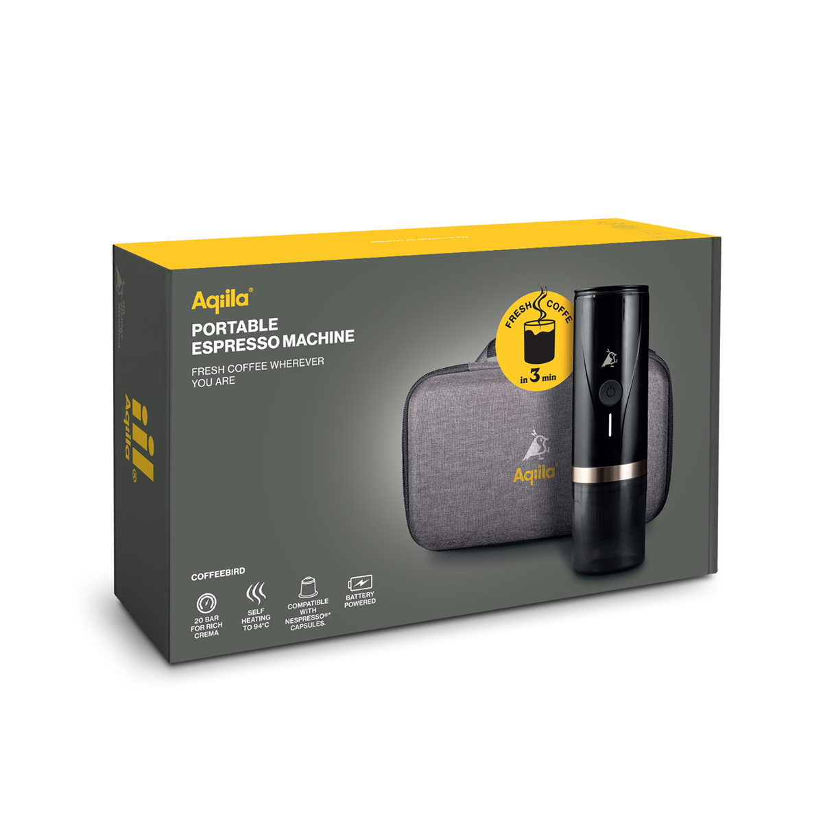 Coffeebird – Enknappslösningen för enkel kaffebryggning. Tillsätt bara vatten och kaffe för en god, varm kopp när som helst. Det inbyggda batteriet gör den inte bara bärbar, utan förser dig också med varmt kaffe. Brygg ditt kaffe med antingen Nespresso®-kapslar eller vanligt malet kaffe. Njut av flexibiliteten att välja din föredragna kaffetyp. Lätt att rengöra och underhålla – alla tillbehör kan diskas. Coffeebird levereras med en praktisk förvaringsväska som gör det enkelt att bära med sig och förvara den.