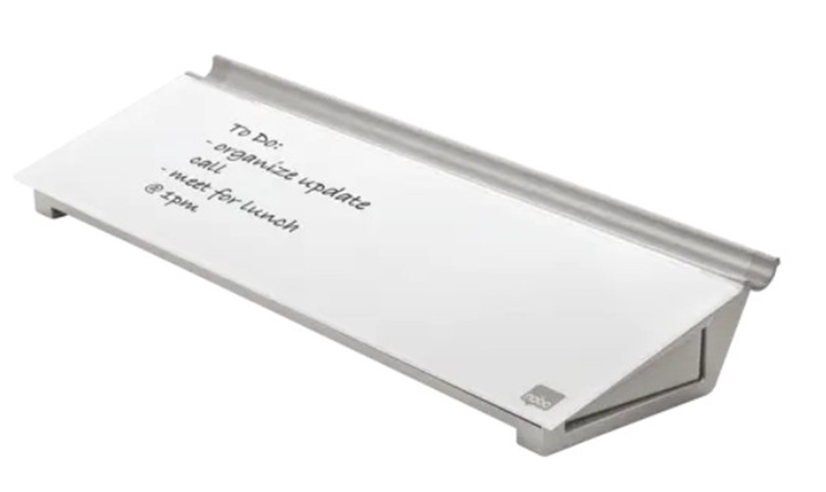 Denna flyttbara skrivtavla för skrivbordet är ett användbart tillskott till alla arbetsplatser hemma eller på kontoret på grund av dess snygga ramlösa design och förstklassiga glasyta. Den praktiska integrerade förvaringslådan och den avtorkningsbara glasytan gör den till en idealisk memo-tavla och anteckningsverktyg; skriv helt enkelt, torka bort och börja om. Alternativt kan du skriva eller fästa tillfälliga anteckningar på glasytan. Den högkvalitativa glasytan ger också högsta motståndskraft mot fläckar och repor. Levereras med en whiteboardpenna. Mått: 45,8x14 cm.