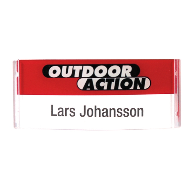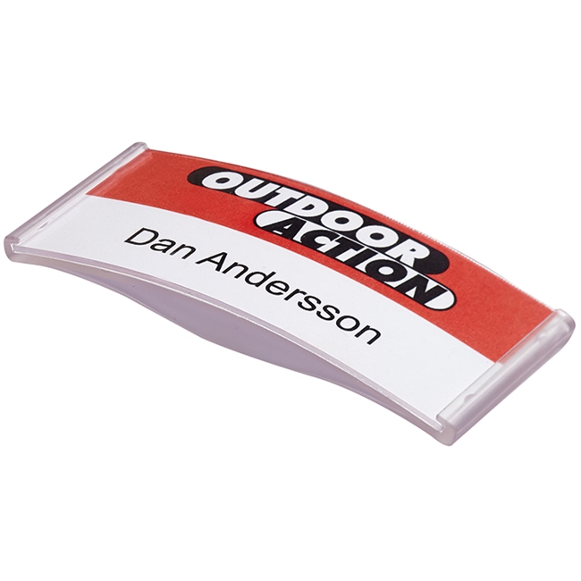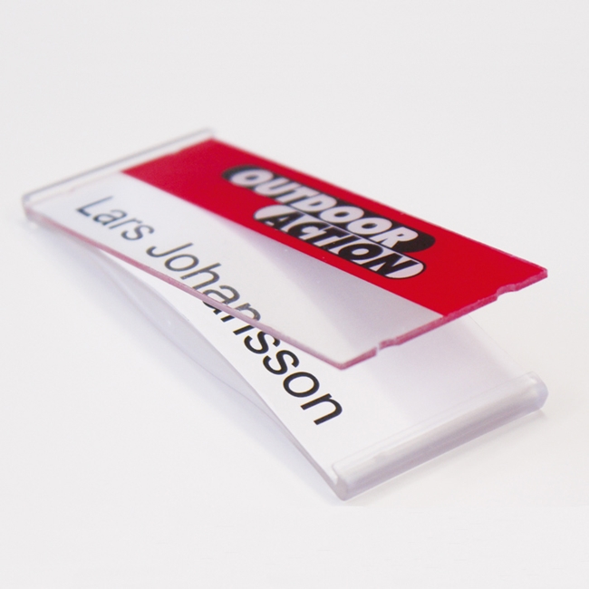 Namnbricka i transparent plast. Skriv ut egna namnetiketter som används till brickan. Storlek: 78x32 mm.