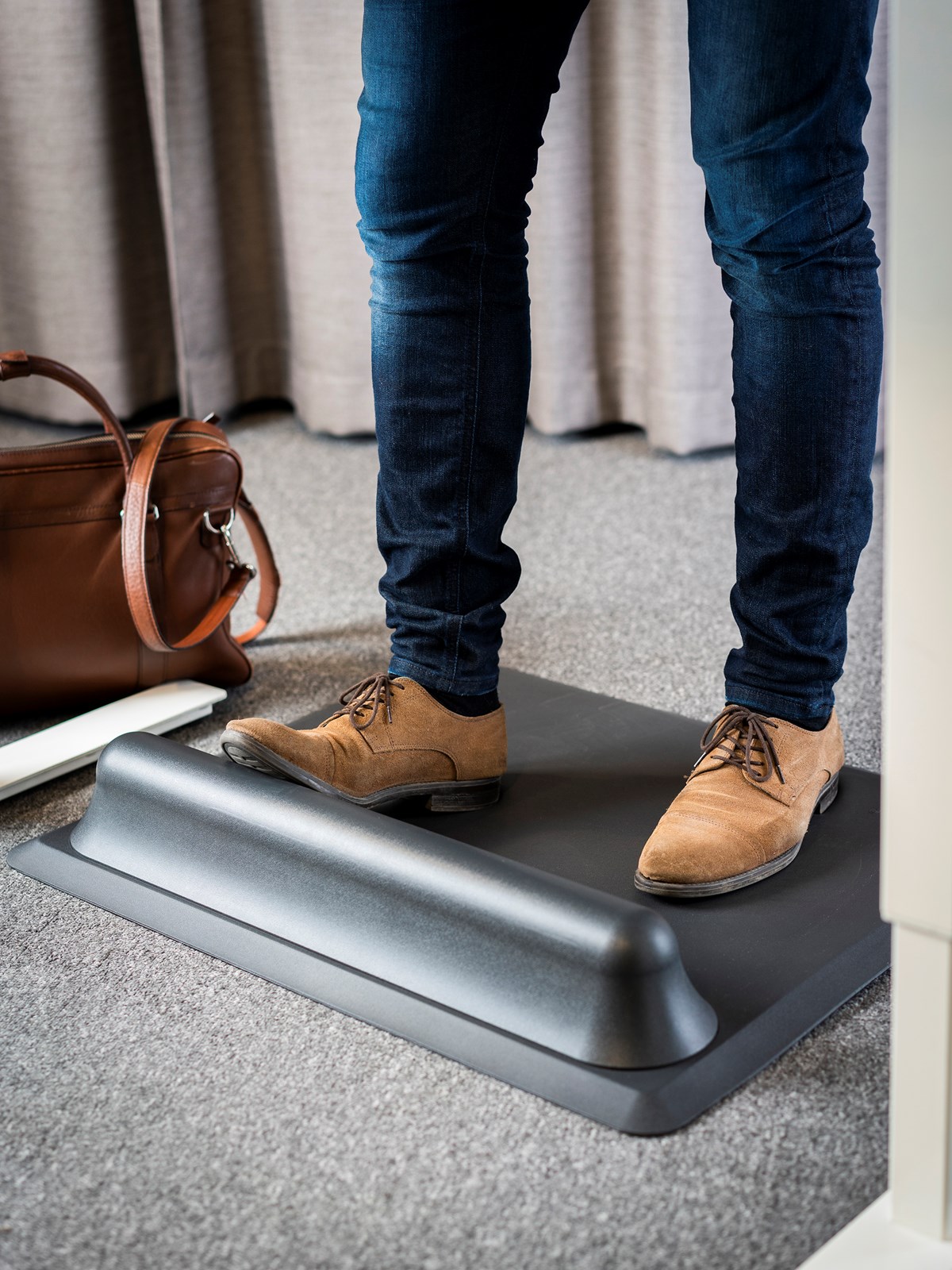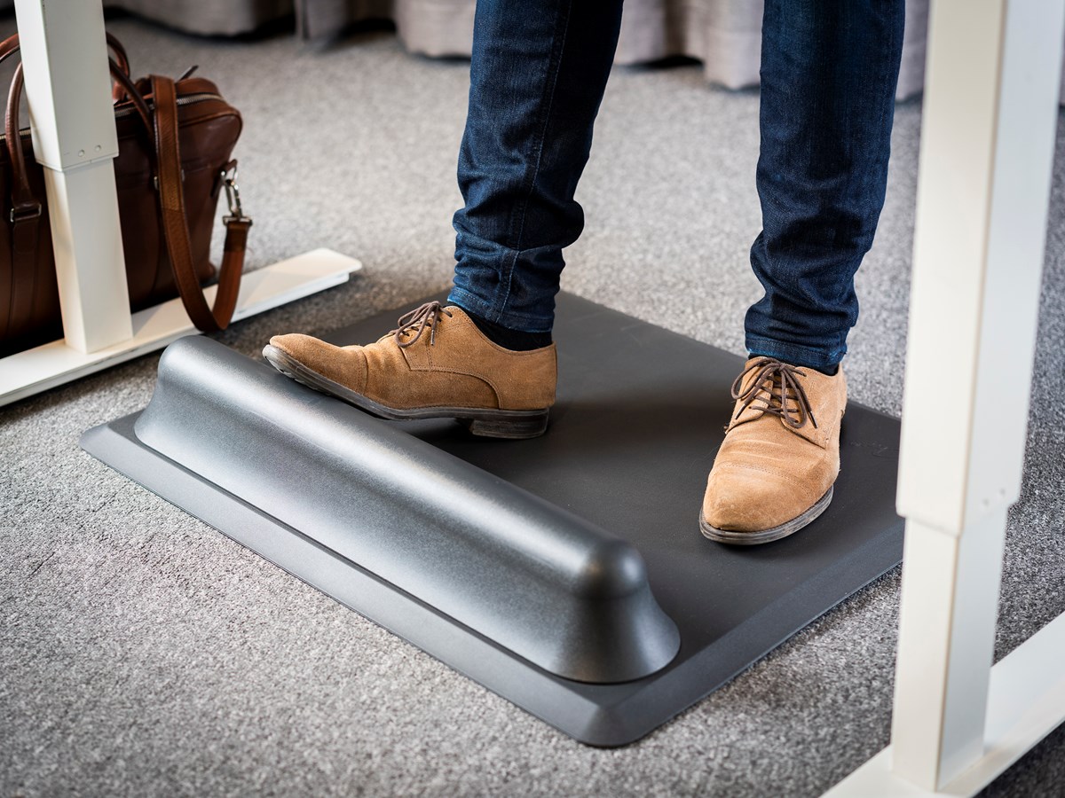 Revolutionerande och unik ståmatta. Fotstödet ger möjlighet till naturlig positionsförändring vilket tillsammans med mattan minskar belastningen på dina ben, rygg och nacke. Mått: 73 x 61 x 3/10,8 cm.