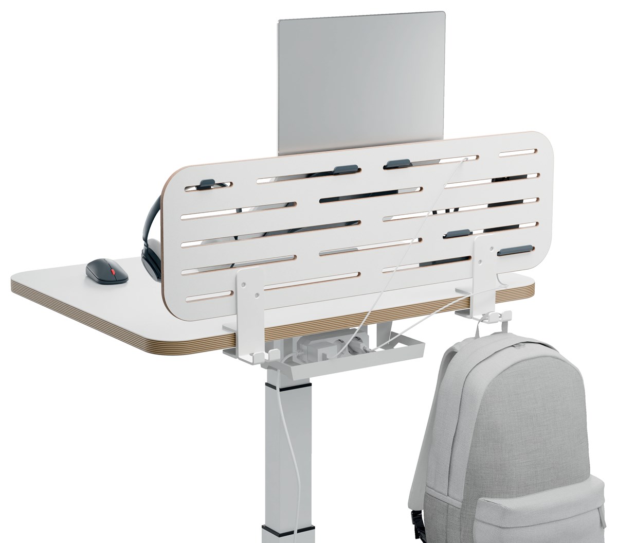 Vertikal förvaringstavla med laptophållare Laptophållaren upp till 15" bärbar dator, maxdjup på 245 mm Fyra skrivbordstillbehör ingår tillverkade av 85 % återvunnen plast Bordstjocklek på max 35 mm Modern och minimalistisk design