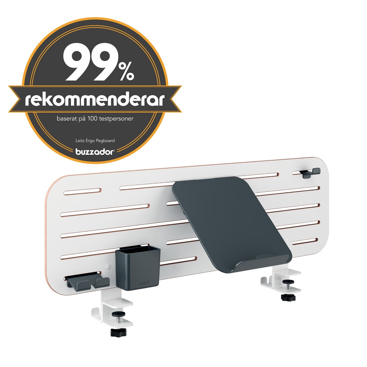 Förvaringstavla till skrivbord med unika horisontella skåror för att frigöra utrymme och hålla ditt skrivbord snyggt. Medföljande laptophållare förbättrar komfort och hållning. Vertikal förvaring för alla dina dagliga nödvändigheter. Förvaringstillbehör i 85 % återvunnen plast medföljer 1 x laptophållare, 1 x smartphonehållare, 1 x pennhållare och 1 x hängkrok för ett headset. Tillverkad av slitstark 8 mm MDF. Kompatibel med de flesta skrivbord med en bordstjocklek på max 35 mm.