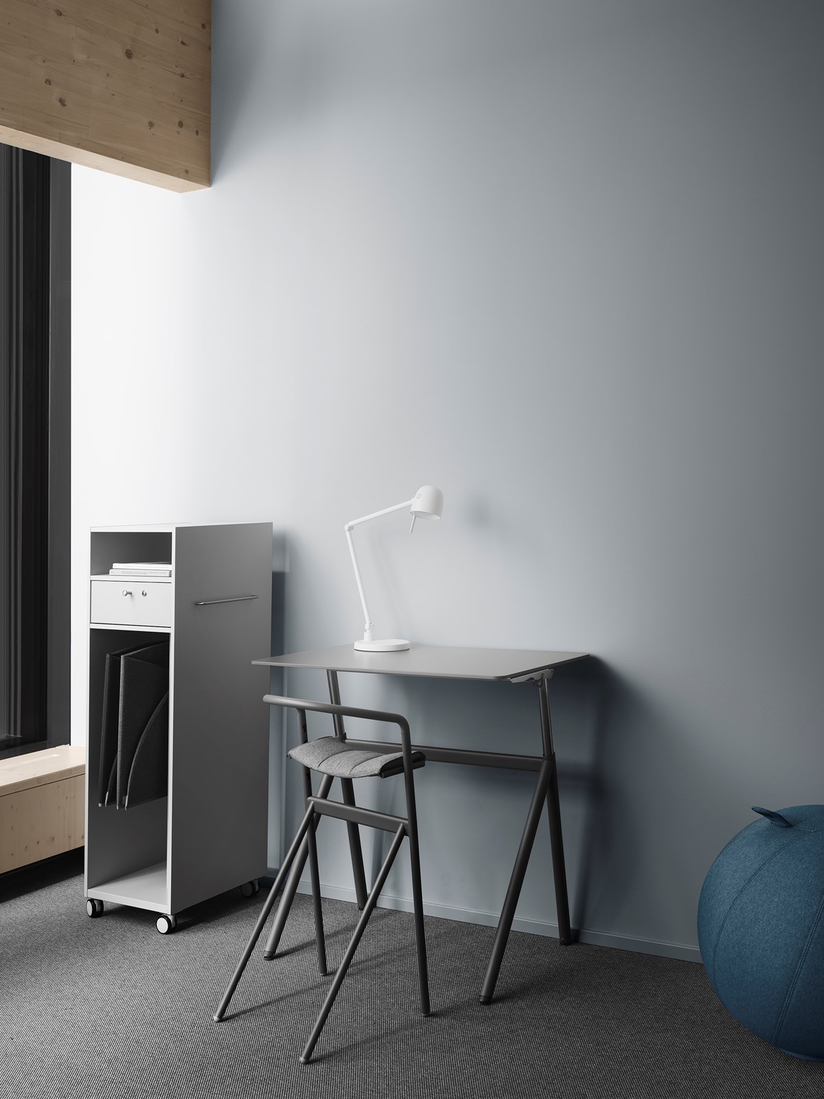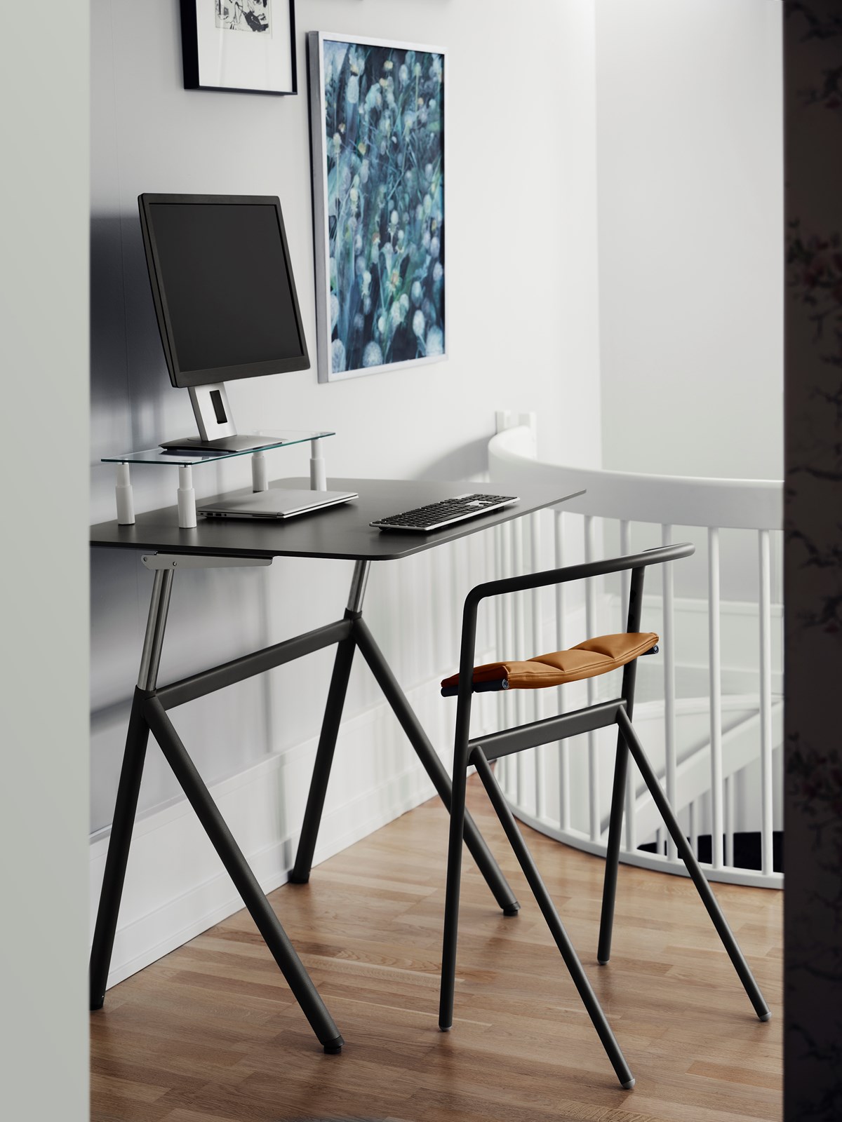 Ett manuellt höj- och sänkbart bord i lagom storlek som gör det mycket lättplacerat. Du behöver inte ta hänsyn till elanslutningar och slipper sladdar på golvet. Bordet passar både på hemmakontoret och på arbetsplatsen. Du höjer och sänker bordet med en gasfjäder som styrs med en spak på sidan, ingen el behövs. Lägsta höjd är 75 cm, högsta höjd är 119 cm.