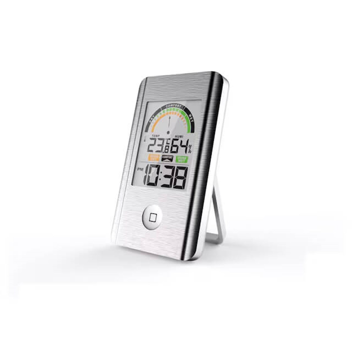 Digital termometer och hygrometer samt klocka för inomhusbruk. Metallfront av borstad aluminium. Kan hängas på väggen eller placeras med hjälp av det utfällbara bordsstativet. Visar temperatur, luftfuktighet, klocka samt indikator med komfortzoner i olika färger. Allt man behöver för ett trevligt inomhusklimat.