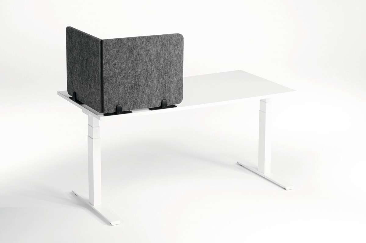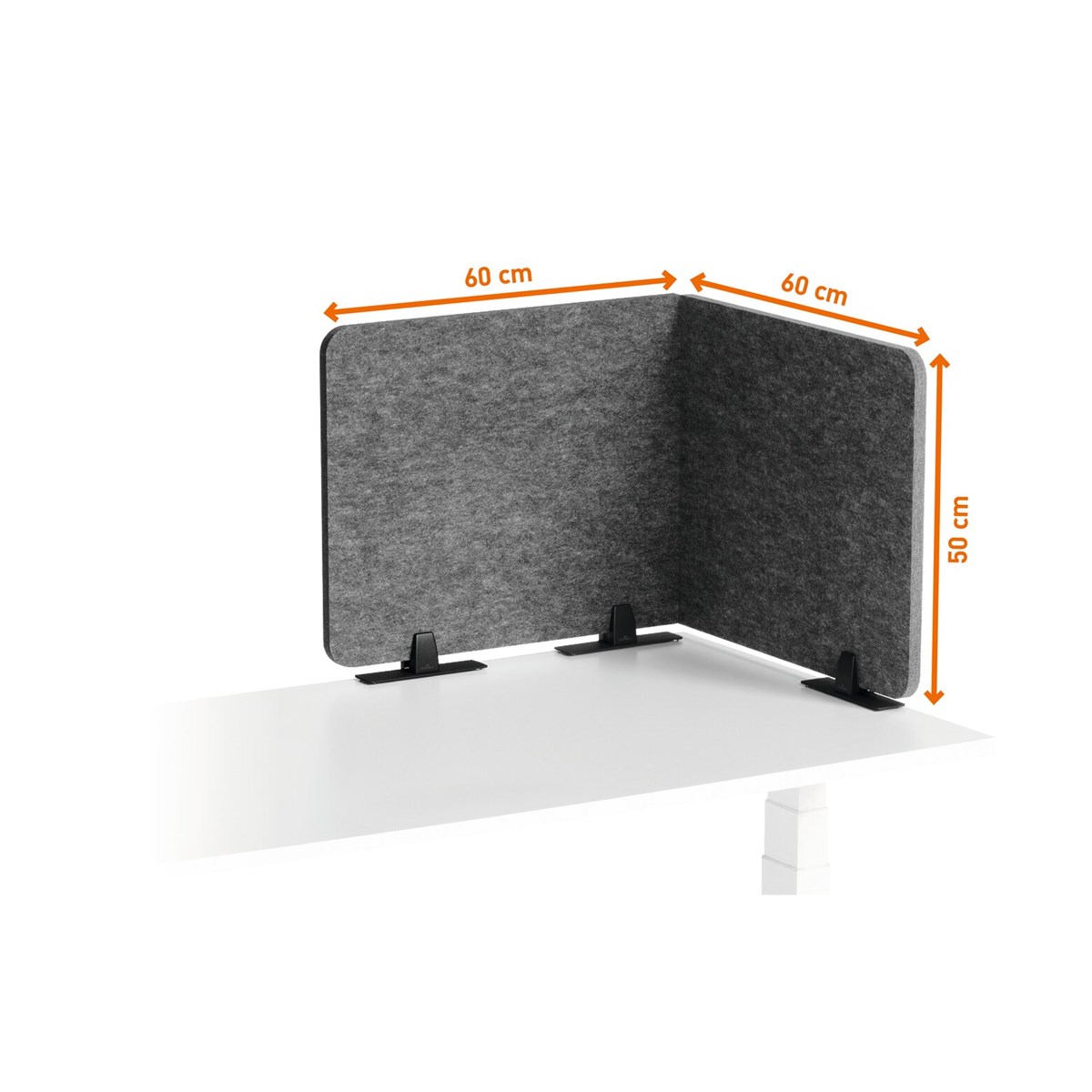 Vikbar bordsskärm av återvunnen PET-filt för effektiv avskärmning och ljuddämpning av arbetsplatsen. Väldigt flexibel skärm som kan anpassas individuellt tack vare steglöst justerbara vinklar. Bordsskärmen kan användas i hela sin längd eller vikas på 4x40 cm för längd 1,60 m eller 2x60 cm för längd 1,20 m. Ger en personlig avgränsning av arbetsplatsen och bättre akustik som minskar störande ljud. Flera olika möjligheter för montering gör att den kan anpassas efter behov. Passar för höj- och sänkbara bord: står stadigt och insynshöjden på 50 cm över bordsskivan bibehålls.
