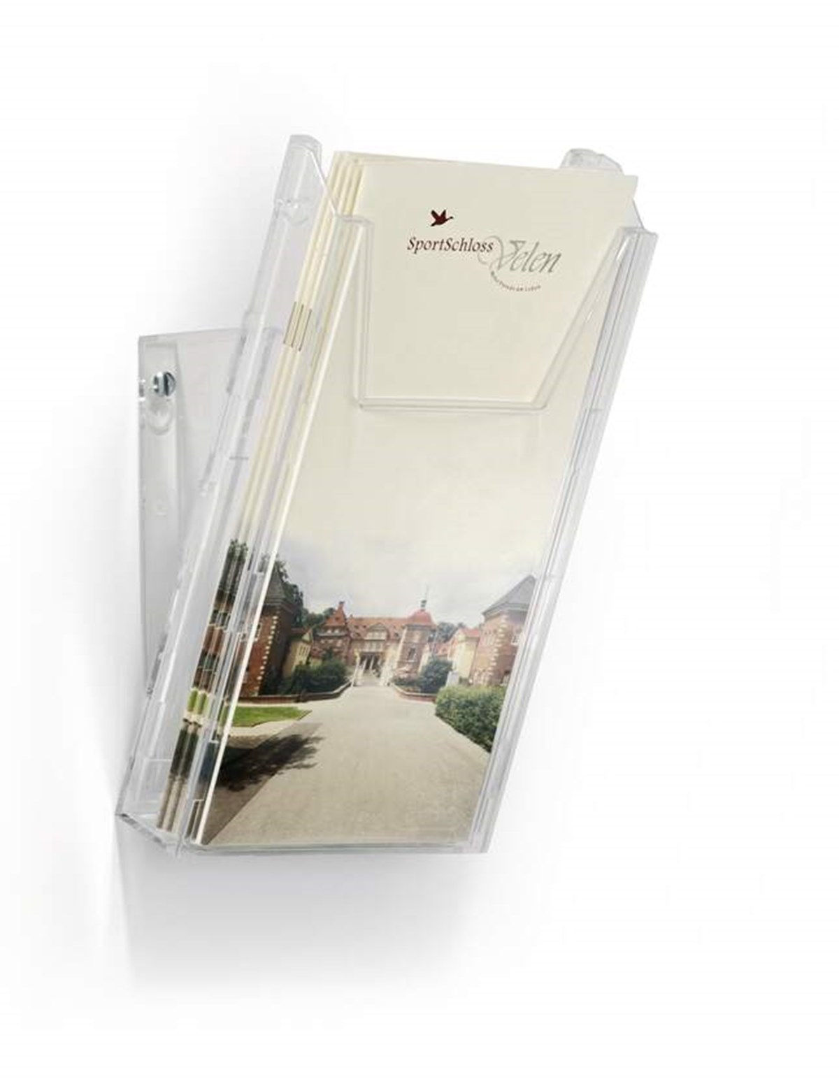 Kombinera som det passar dig med den utbyggbara och multifunktionella COMBIBOXX-serien. Detta fack är för 1/3 A4 eller A6-format (maxformat 210x116 mm) såsom exempelvis säljprospekt, produktblad och broschyrer på mässor, utställningar och i receptioner. Beroende på hur bakstycket monteras kan facket placeras på bordet eller sättas upp på väggen. Facket har en kapacitet på 24 mm tjocka buntar. Setet innehåller 1 fack, 2 bakstycken, 1 frontskiva, 1 adapterskena för att kunna kombinera med COMBIBOXX A4, monteringsanvisning samt skruv och plugg.