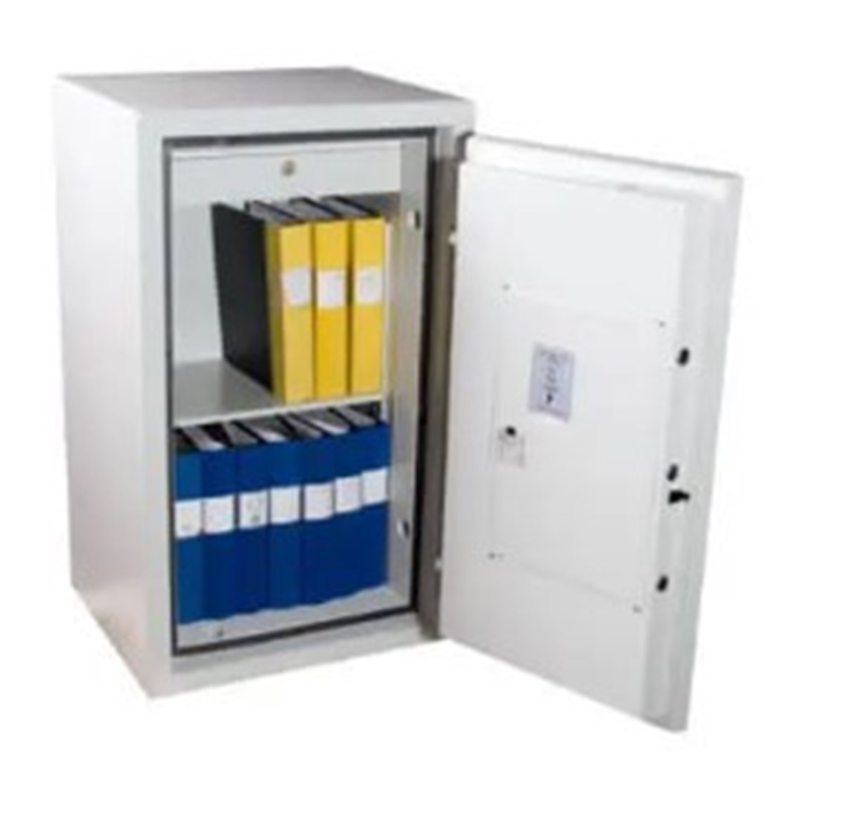 ES 100, 120P är brandsäkra dokumentskåp som skyddar papper vid brand. Skåpen är testade och godkända enligt NT Fire 017 i 120P papper. Skåpen är inredda med flyttbara hyllor för A4-pärmar samt en låsbar låda. Lådan kan lätt demonteras och då kan utrymmet nyttjas till pärmförvaring. Skåpen är som standard utrustade med elektroniskt kodlås med två utbytbara koder. Låset är borrskyddat med en sprängsäkring som låser regelverket vid inbrottsförsök. Brandklass: Brandsäkert i 120 min. Utv. mått mm: H: 992 B: 585 D: 507 Inv. mått mm: H: 833 B: 426 D: 346 Vikt 200kg