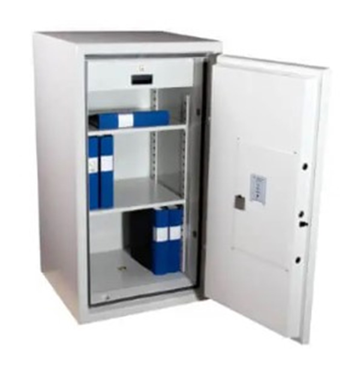 ES 150, 120P är brandsäkra dokumentskåp som skyddar papper vid brand. Skåpen är testade och godkända enligt NT Fire 017 i 120P papper. Skåpen är inredda med flyttbara hyllor för A4-pärmar samt en låsbar låda. Lådan kan lätt demonteras och då kan utrymmet nyttjas till pärmförvaring. Skåpen är som standard utrustade med elektroniskt kodlås med två utbytbara koder. Låset är borrskyddat med en sprängsäkring som låser regelverket vid inbrottsförsök. Brandklass: Brandsäkert i 120 min. Utv. mått mm: H: 1171 B: 642D: 630 Inv. mått mm: H: 1012 B: 483 D: 463 Vikt 285kg