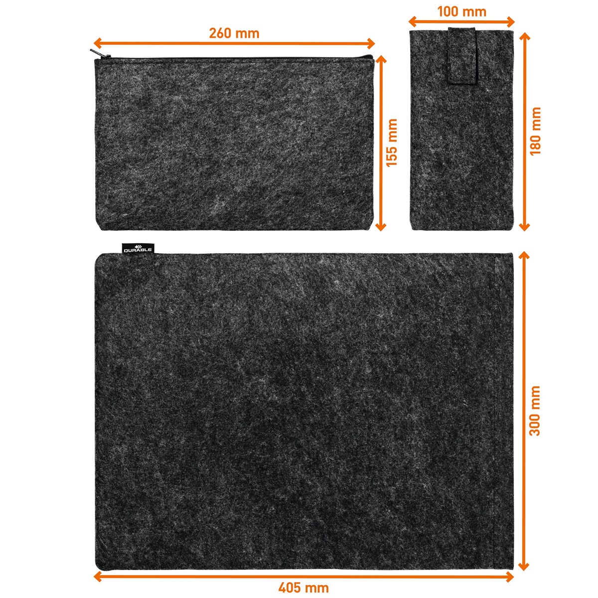 Yttermått laptopfodral: 40,5 x 30 cm Yttermått tillbehörsetui: 26 x 15,5 cm Ytermått mobilfodral: 18 x 10 cm (för smartphone upp till 6,8")
