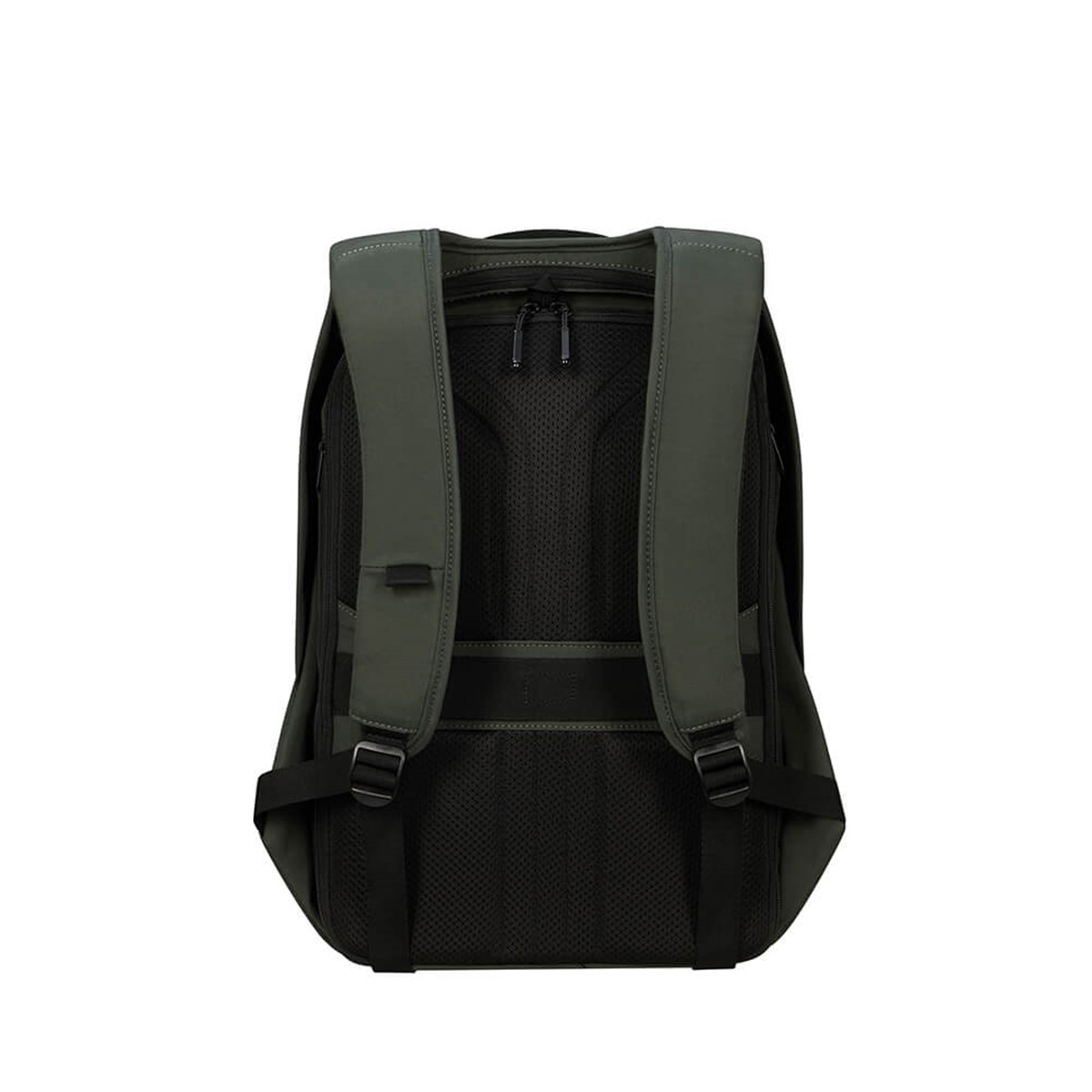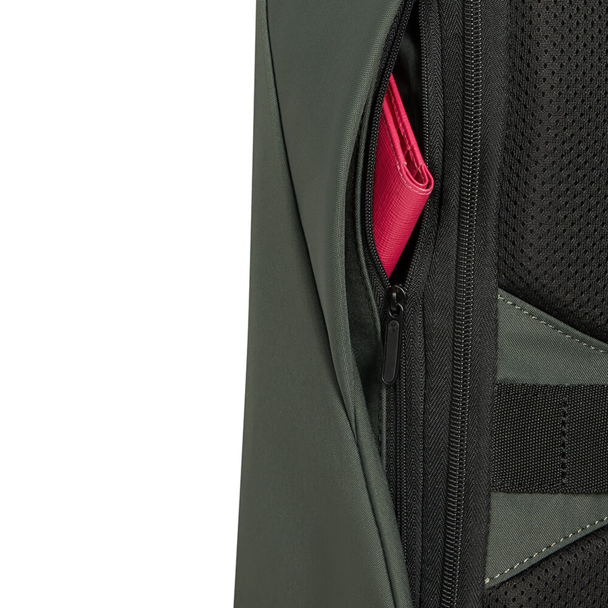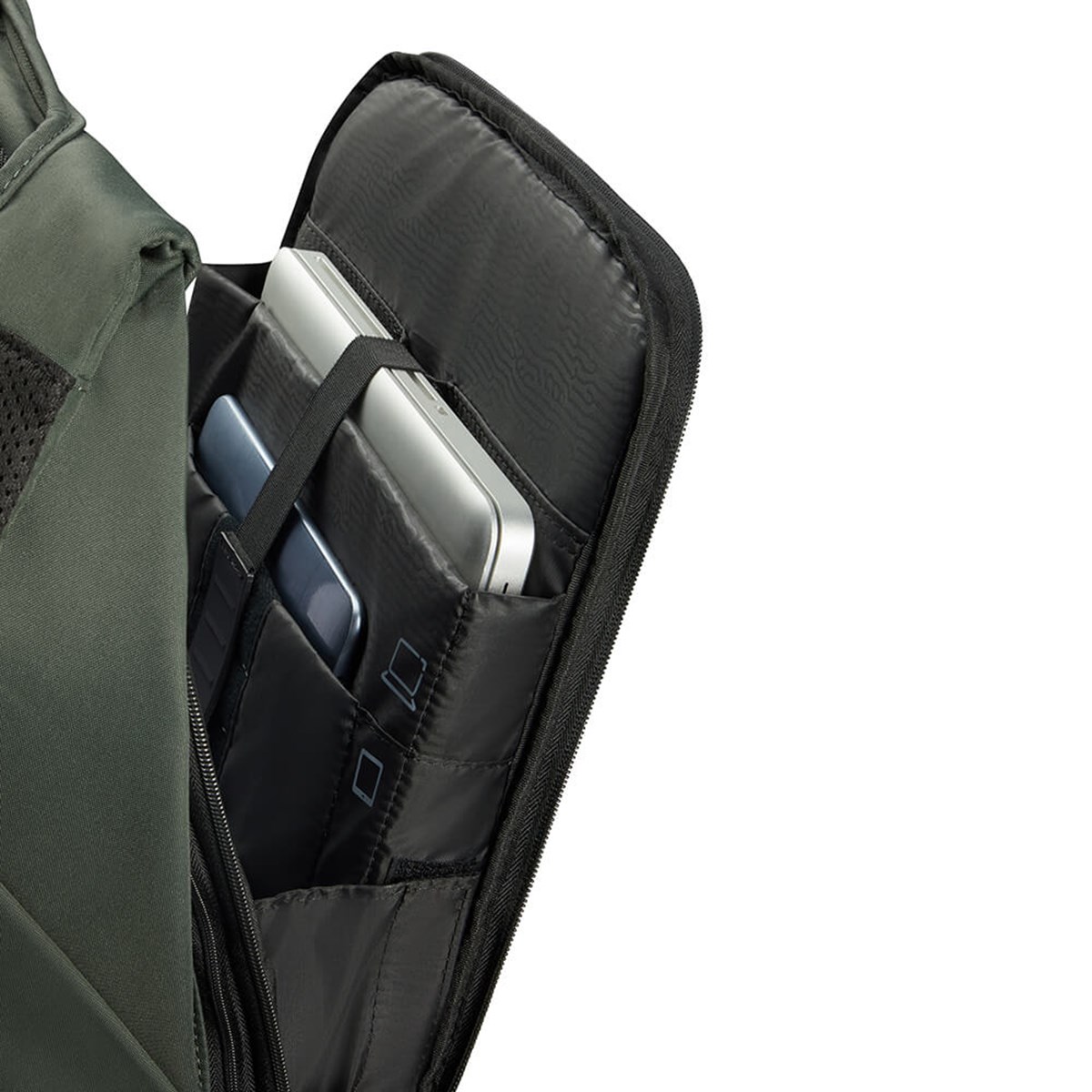 Huvudfacket öppnas bakifrån Ficka med RFID-skydd och dolda sidofickor Skärresistent material Ergonomiska ryggsäcksremmar Fack för powerbank