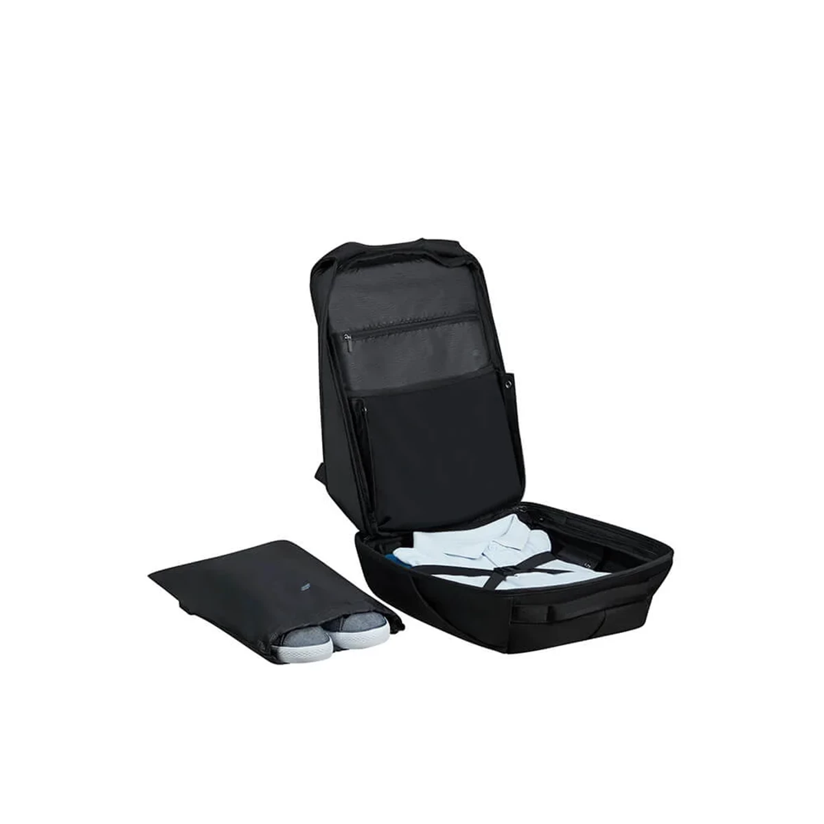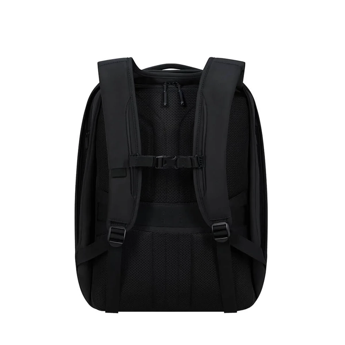 Yttertyget, innerfodret, baksidan, de yttre och inre dragkedjorna och AirMesh-tyget är tillverkade av 100% återvunnet PET, en del av Samonites Recyclex™ Material Technology Initiative. Ytbehandlingen på tygerna är tillverkad av nya material. Genom att placera RFID-blockerande material mellan produktens yttre lager och inre foder blir fack och fickor RFID-blockerande och skyddar emot betalnings- och identitetsstöld via skimming. Ryggsäcken har fack för dator och surfplatta 10.5" .