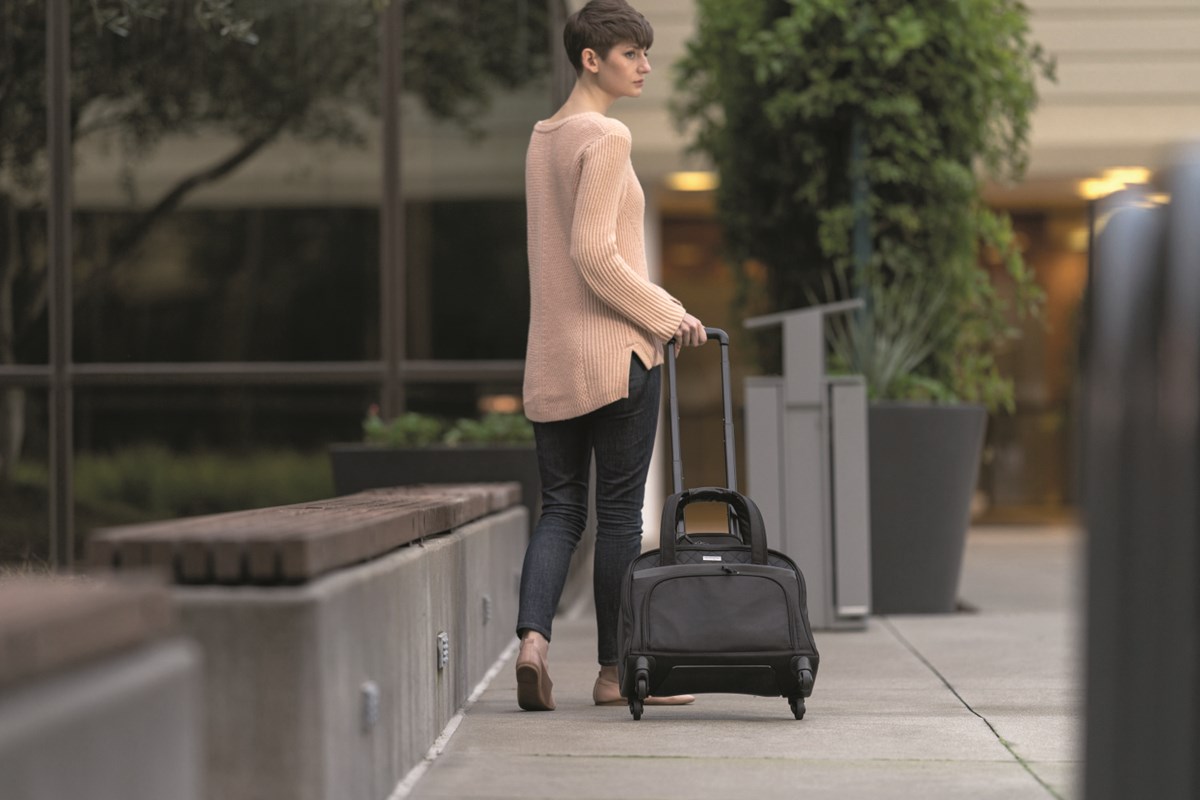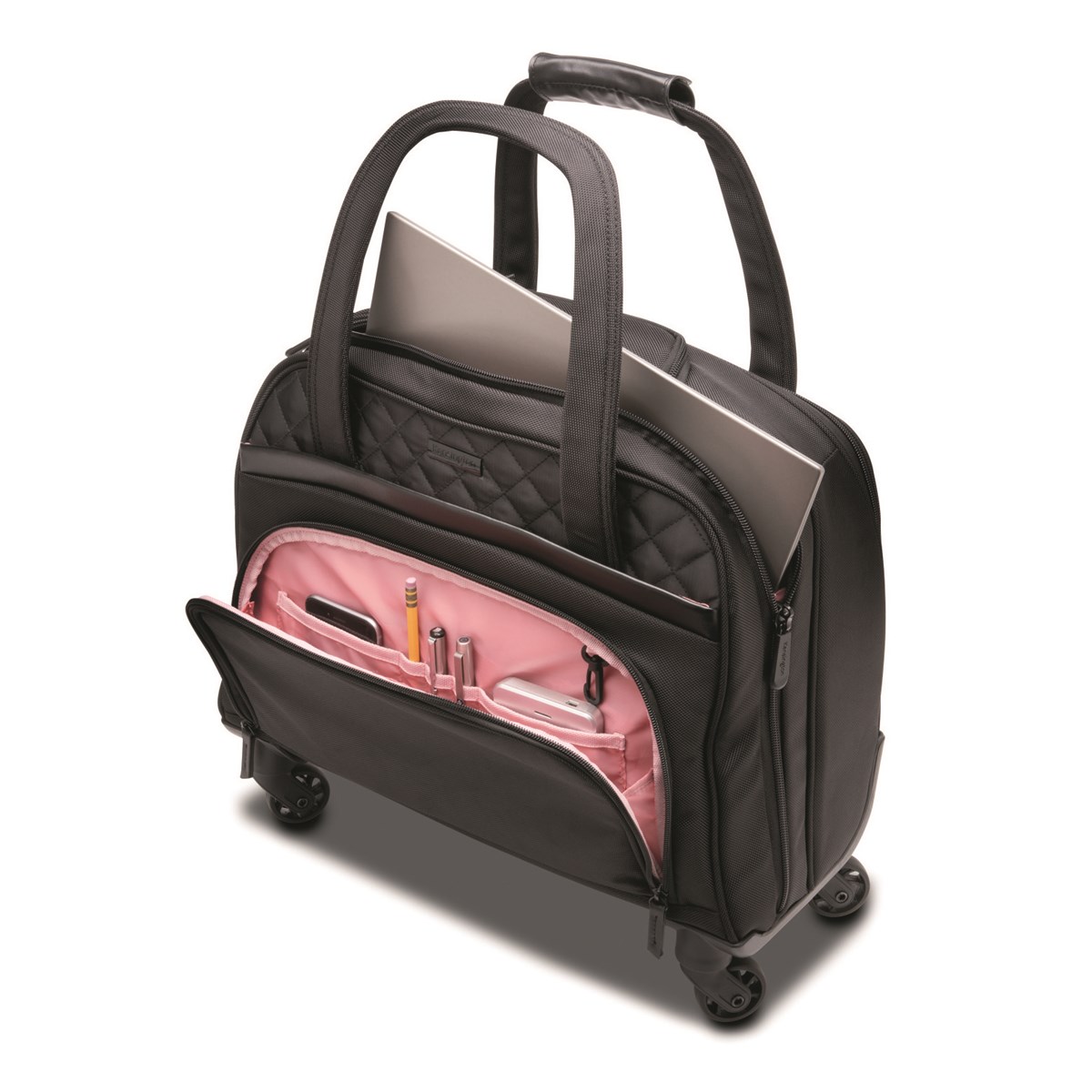 Väska med fyra hjul och mjuka former. Fack med fallskydd för bärbar dator upp till 15,6 tum och 12,5 tum surfplatta. Flera lättillgängliga fickor. Bärhandtag och dolt teleskophandtag, kan fästas på en större rullväska. Blixtlås med punkteringsskydd. Svart, vattentät och tålig ballistisk 1680D polyester med rosa detaljer inuti. Mått: 445 x 430 x 200 mm. 5 års garanti.