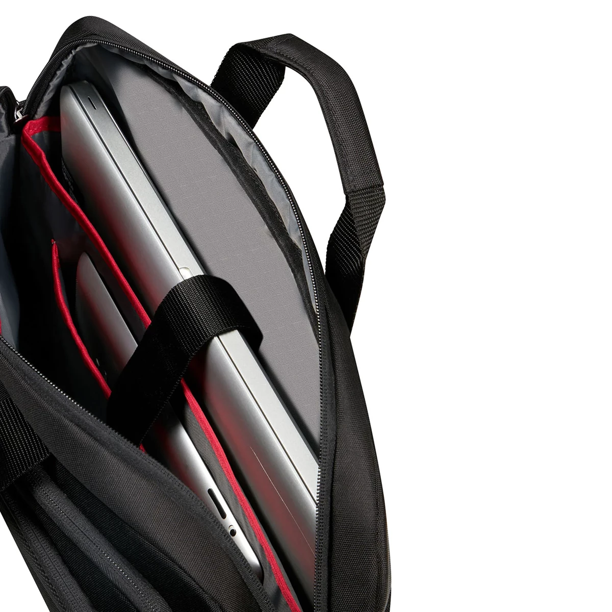Tillverkad av återvunnen PET-plast Ergonomisk axelrem Separata fack för laptop och surfplatta Vattenavvisande återvunnen polyester Modern design med färgaccenter