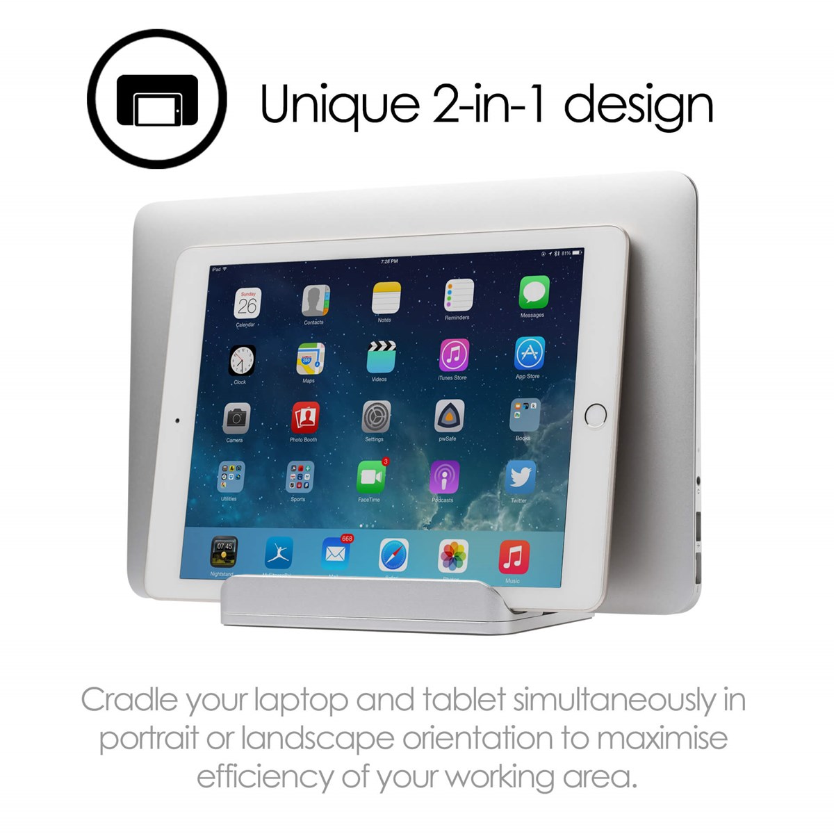 Premium aluminiumlegering matchar elegant bärbara PC, och Apple-produkter som Mac, iMac, MacBooks, iPads och iPhones. Montera din bärbara dator och surfplatta samtidigt i stående eller liggande riktning, för att maximera effektiviteten i ditt arbetsområde.