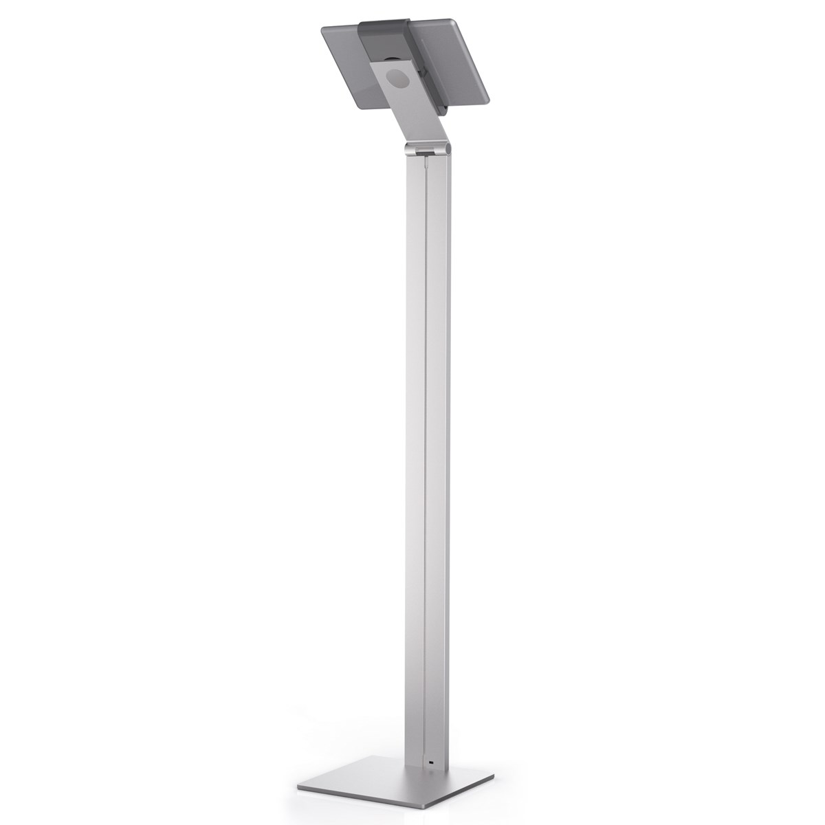 Stadigt golvstativ för 7-13 tums surfplattor Öppning i hållaren för laddningskabeln, USB-anslutningskabel ingår, kabelkanal på baksidan av benet Lås och nyckel medföljer för att låsa fast surfplattan Kan vridas 360° för stående eller liggande läge, samt steglös vinkeljustering för god läsbarhet