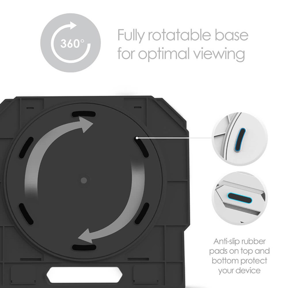 Ställets 360-graders roterbara bas ger dig optimal flexibilitet och låter dig enkelt justera din arbetsyta för maximal komfort. Den lätta och helt hopfällbara designen gör stället extremt portabelt och enkelt att packa ner i väskan. Taktila silikonplattor säkerställer ökad stabilitet och skyddar både din bärbara dator och mobiltelefon. Mått (hopfällt): 290x265x20 mm. Maxvikt: 3 kg.