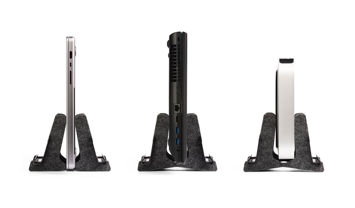 Två hyllister av pulverlackerat stål kan användas för surfplattor, mobiler eller pennor. I stängt skärmläge cirkulerar luften bra, vilket minimerar risk för överhettning. Filten som ingår är ett mjukt, ljuddämpande och tåligt filtmaterial, tillverkat av 60% återvunnen PET.