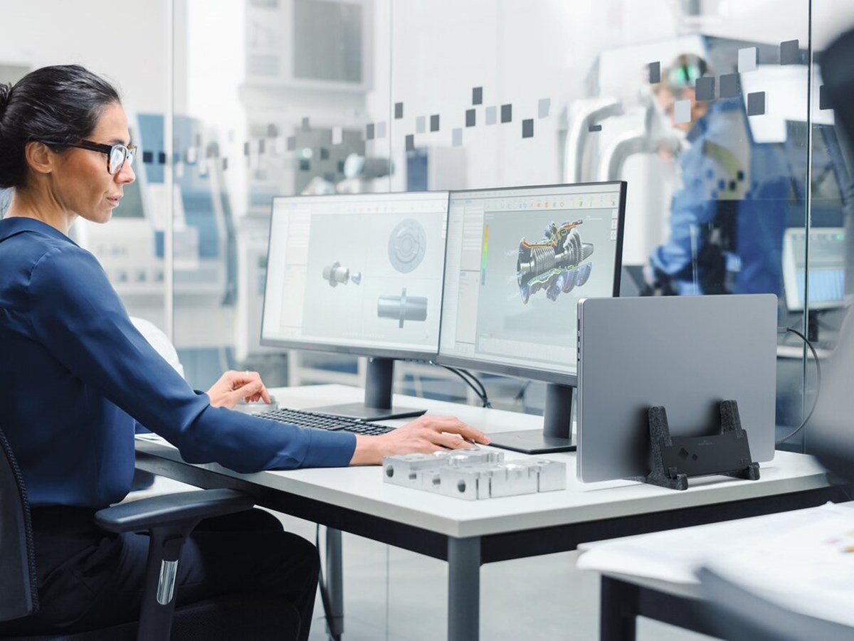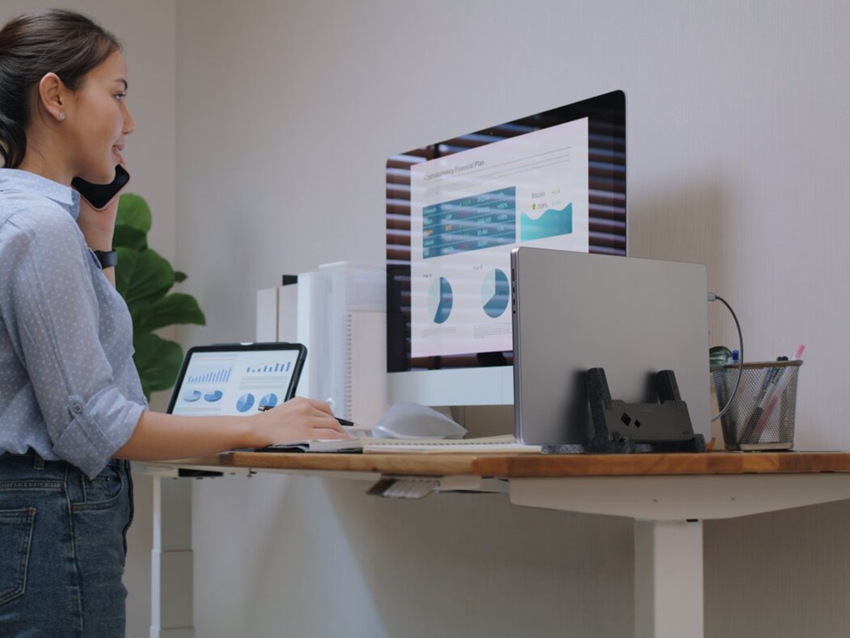 Laptopstället VERTICAL EFFECT för 13-17"" laptops, med en tjocklek på 10-36 mm och vikt mellan 0,9 och 3 kg, är platsbesparande och frigör arbetsyta. Den bärbara datorns vikt justerar bredden på laptopstället och gör att den hålls säkert på plats.