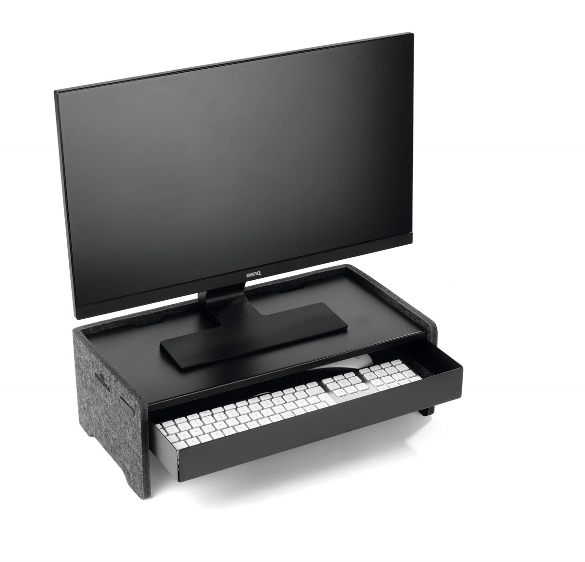 Med ett skärmställ hamnar datorskärmen på en bra ergonomisk höjd samtidigt som det frigör bordsyta. Kombinera med en låda för förvaring av pennor, dokument, kablar mm. EFFECT-serien som denna låda ingår i, tillverkas av metall och har en mjuk, ljuddämpande och tålig bottenmatta av filt. Filten är tillverkad av PET plast, varav 60% är av insamlad och återvunnen PETplast (rPET). Material från lådans botten har använts till två glidskenor, som fästs i skärmstället. Hålen efter dessa skenor täcks av filtmattan. Produkterna i serien är 100 % återvinningsbara och förpackas hållbart med resursbesparande och plastfria material. Maxbelastning 5 kg. Mått: 46,8 x 5,3 x 22,1 cm (BxHxD) Tillbehör: Skärmställ EFFECT, art.nr 508158