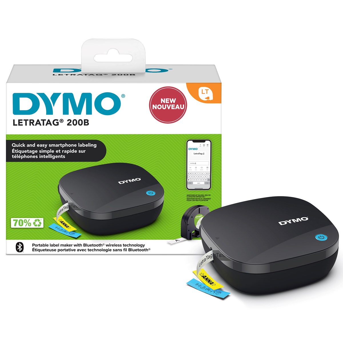 Med den bärbara DYMO® LetraTag® 200 Bluetooth kan du skriva ut en lång rad olika etiketter i olika färger direkt från din smartphone eller surfplatta. Hemmet och hemmakontoret organiseras enkelt med hjälp av den intuitiva LetraTag® Connect-mobilappen. LetraTag® 200B får enkelt plats i väskan och är redo att köra på bara några sekunder, tack vare dess automatiska Bluetooth-anslutning. 200B fungerar med LetraTag®-originaltejp och har ett kassettskal som är tillverkat av 100 % återvunnet material. Dessutom är papperstejpen FSC®-certifierade. Idealisk för alla dina märkningsbehov i allt från köket, badrummet, barnrummet och studentkorridorens förvaringsutrymmen till hemmakontoret - du kan t.o.m. hålla koll på barnens kläder och ryggsäckar med LetraTag® påstrykningsbara tygetiketter.