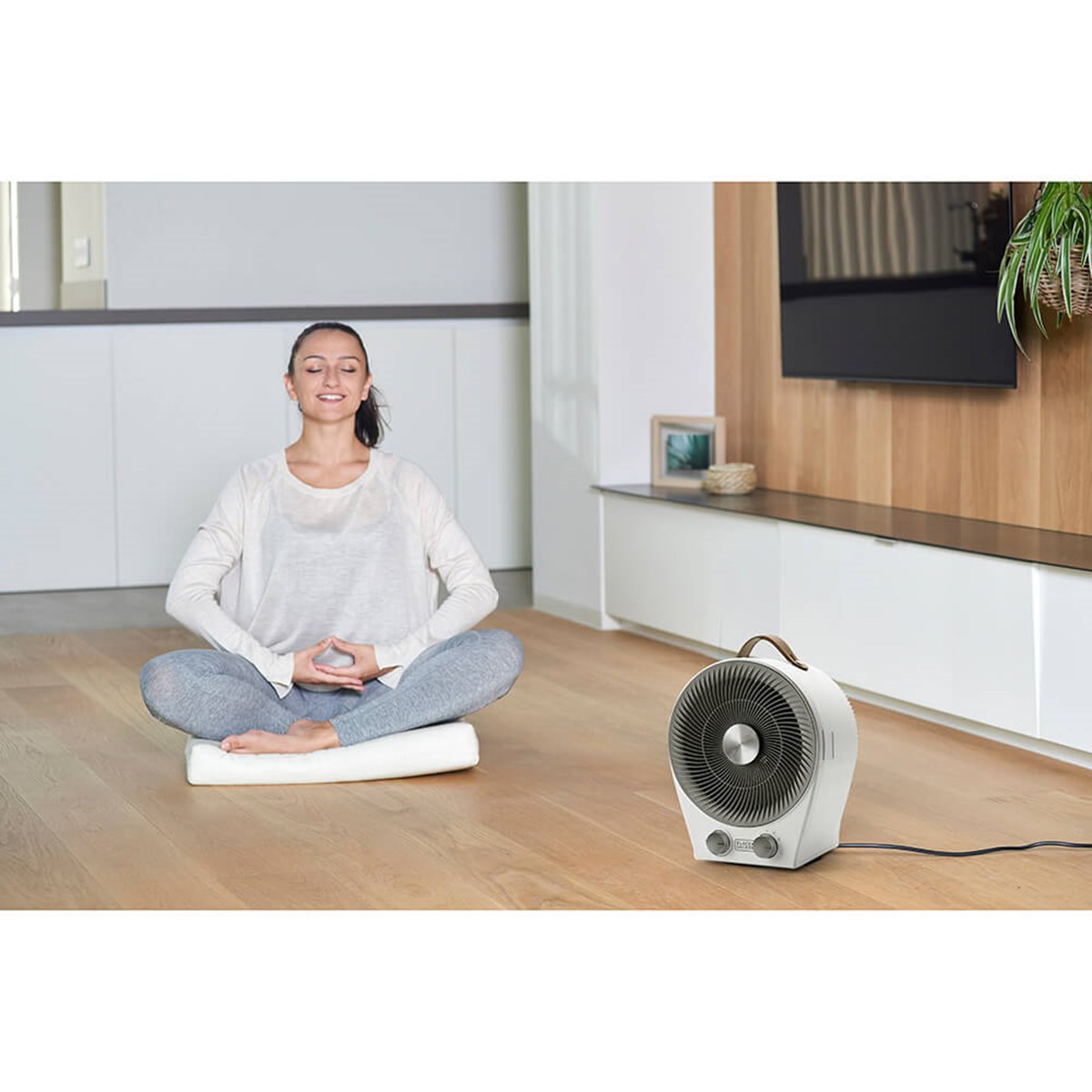 2 värmeinställningar (1000-2000 W) och justerbar termostat för maximal komfort. 2 starka fläktlägen för att cirkulera luft och fräscha upp rummet. Säkerhetsfunktion med automatisk avstängning vid överhettning. Inbyggt handtag säkerställer enkel portabilitet. Lämplig för rum upp till 20 m².
