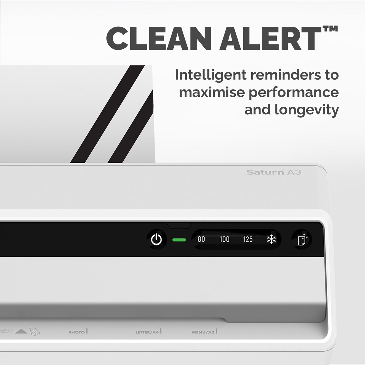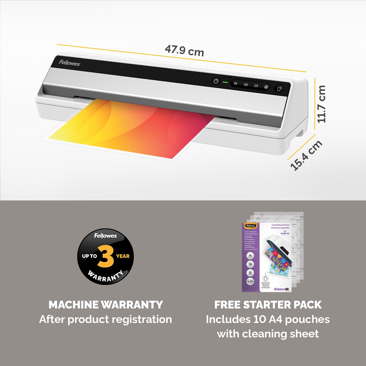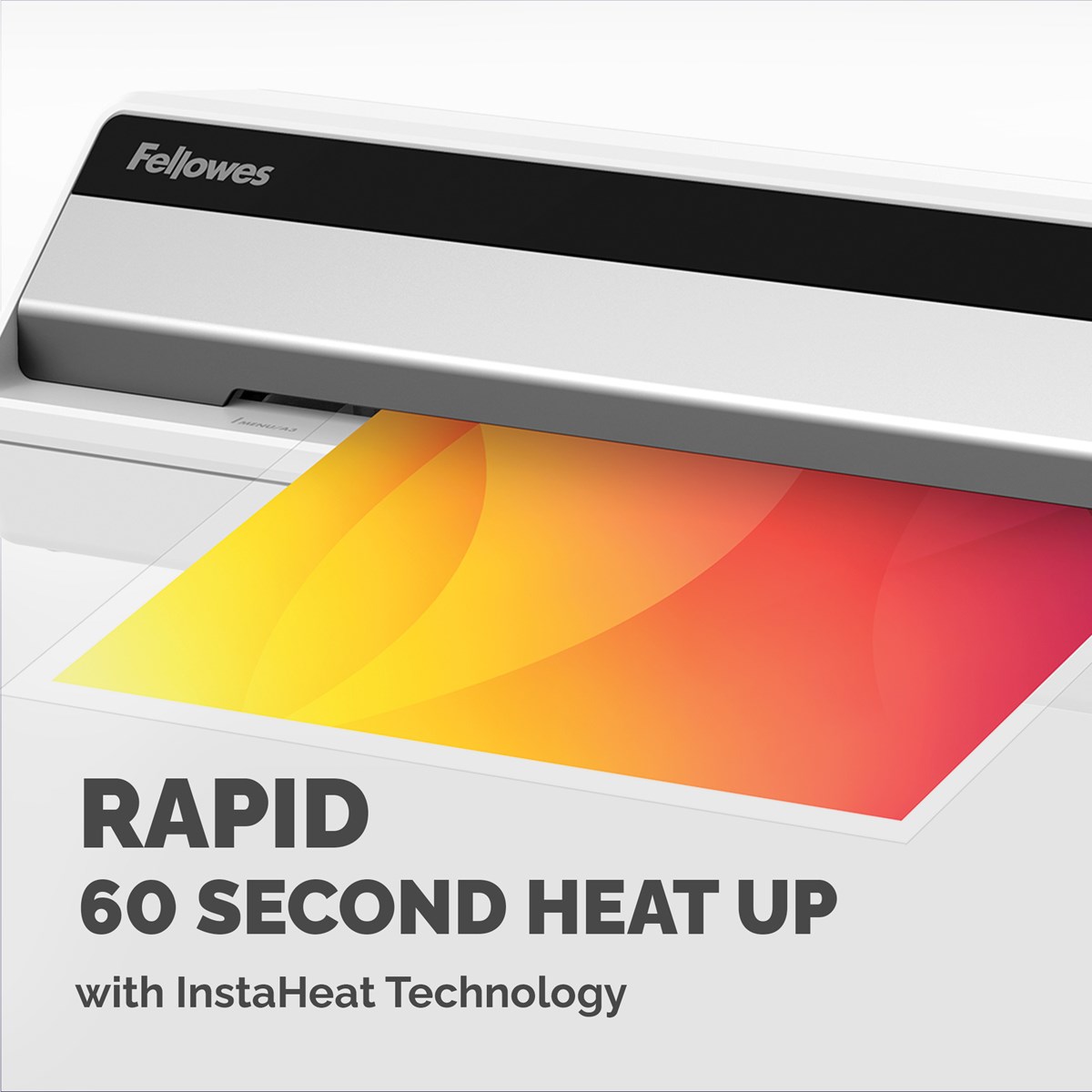 Fellowes Saturn 3i A3 lamineringsmaskin - passar det mindre kontoret. Kan både varm- och kall laminera. Inkluderar startpaket med 10 lamineringsfickor samt rengöringsark. InstaHeat Technology ger en uppvärmningstid på enbart 60 sekunder. Lamineringshastighet på 50 cm per minut. Klarar lamineringsfickor upp till 125 mikron.