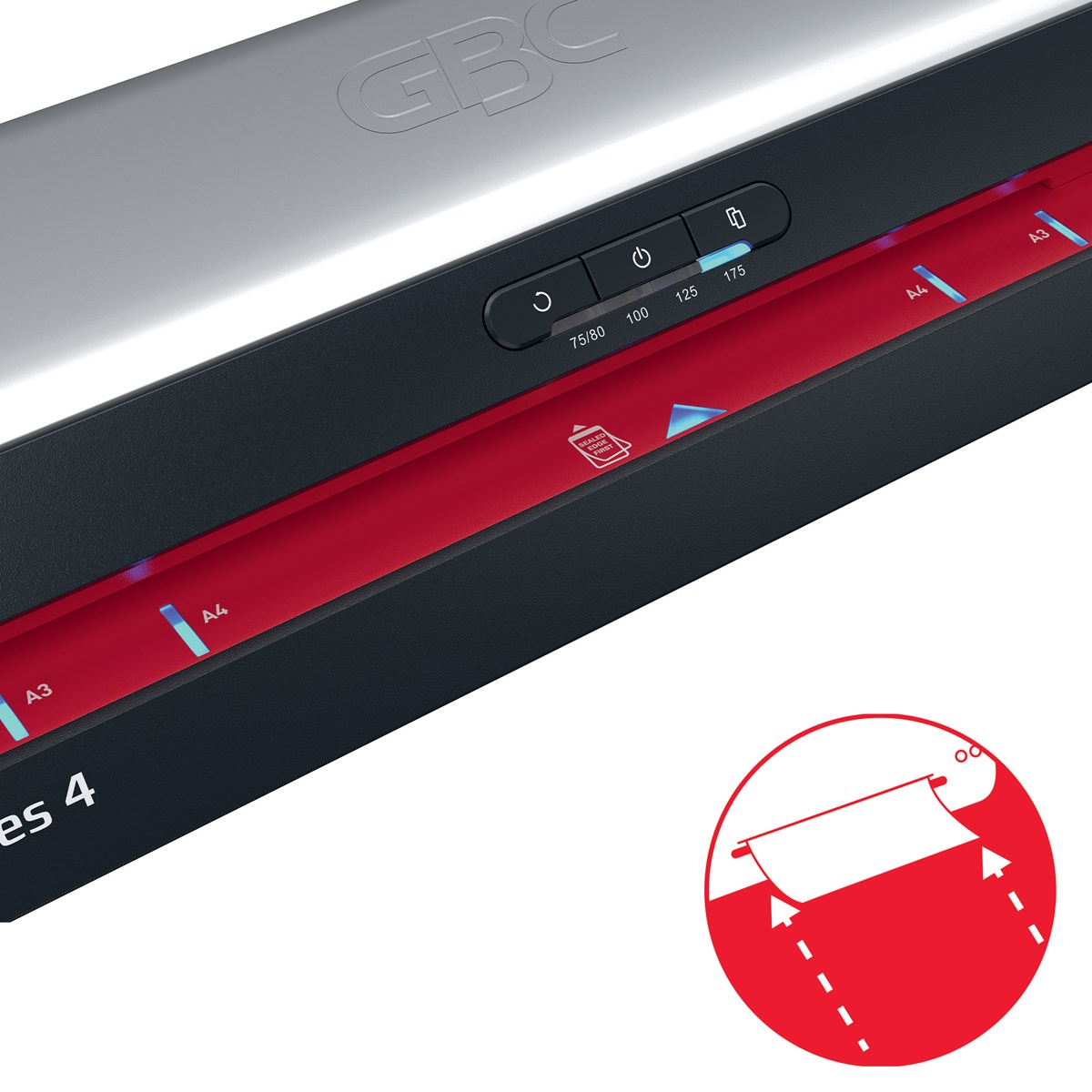 Snabb uppvärmningstid, klar att använda på bara 1 minut. Kompatibel med lamineringsfickor från 75 till 175 mikron. Laminerar ID-kort upp till dokument i A3-storlek. Användning med GBC:s höghastighetsfickor minskar lamineringstiden med 30%. Laminerar ett A4-dokument (75 mikron) på endast 23 sekunder. Laminerar 26 x A4 på 10 minuter. SMART LED-status: lyser rött under uppvärmning och blått med en akustisk signal när den är redo att användas.