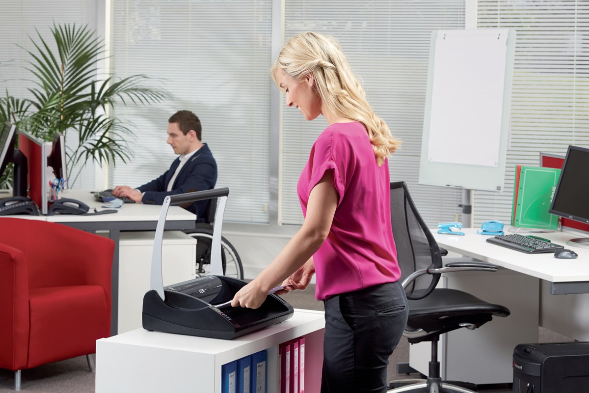 Plastspiralbindare för regelbunden kontorsanvändning. Enkel inbindning tack vare lågkraftsstansning och indikator för pappersinriktning. 2 års garanti.