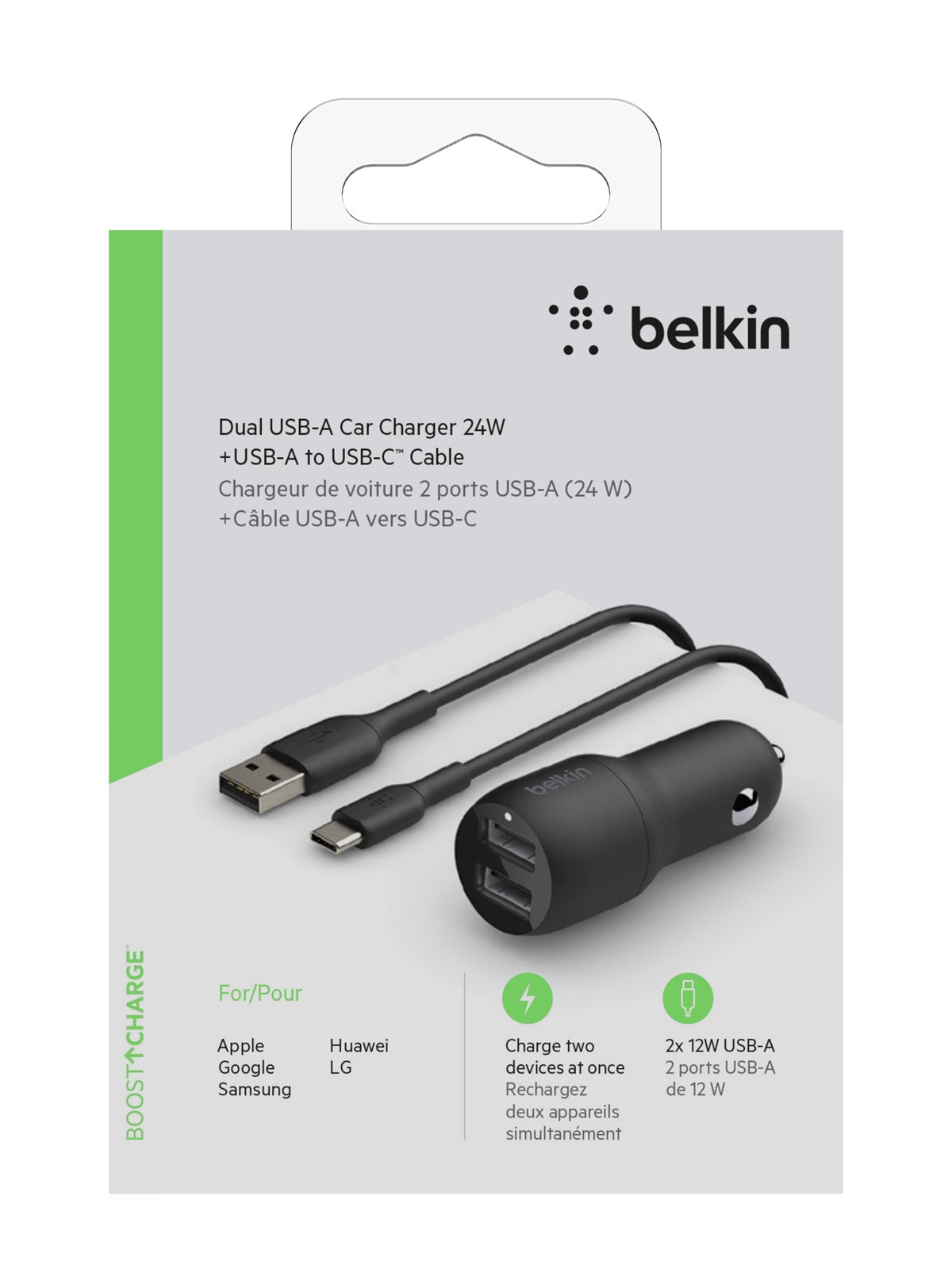 Dubbla USB-A-portar laddar två enheter samtidigt. 12W effekt från varje port för 24W total uteffekt. USB-C-kabel medföljer.