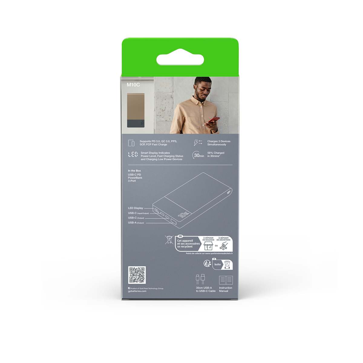 M2+ PowerBank laddar din telefon till mer än 58% på bara 30 minuter! En fulladdad M2+ Powerbank räcker till två laddningar för din smartphone. Den tydliga batterinivåindikatorn i procent visar återstående batteri. Med sina sex olika säkerhetsfunktioner och sin robusta konstruktion kommer denna powerbank bli din bästa sidekick för många år framåt. 1 x USB-A och 2 x USB-C samt 6 inbyggnada säkerhetsfunktioner. 2x USB-C 1x USB-A.
