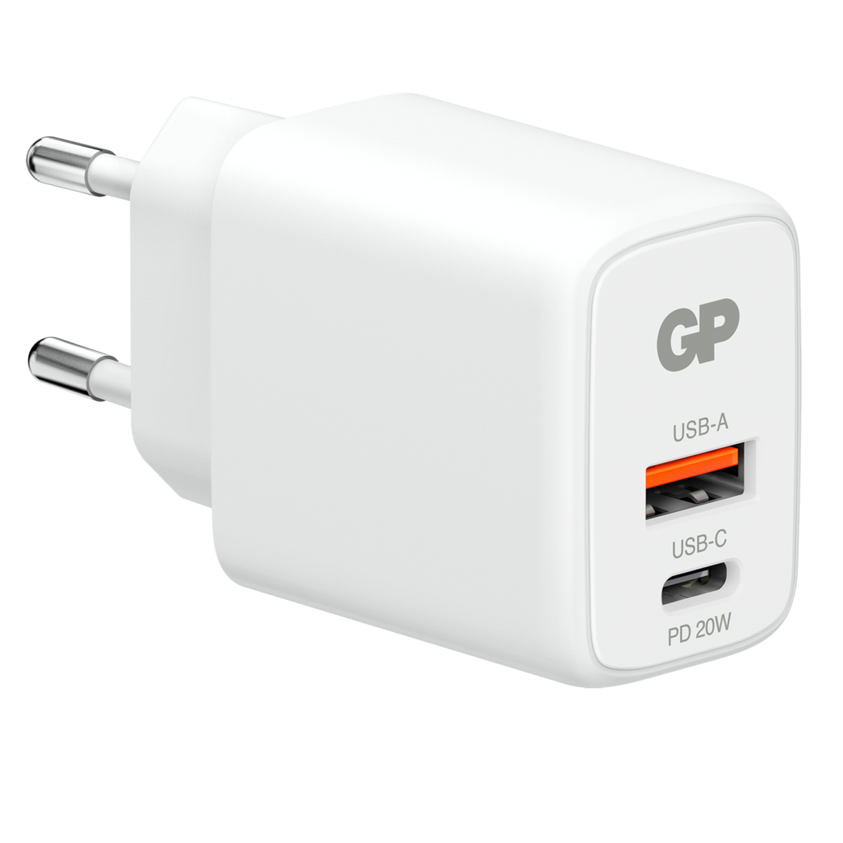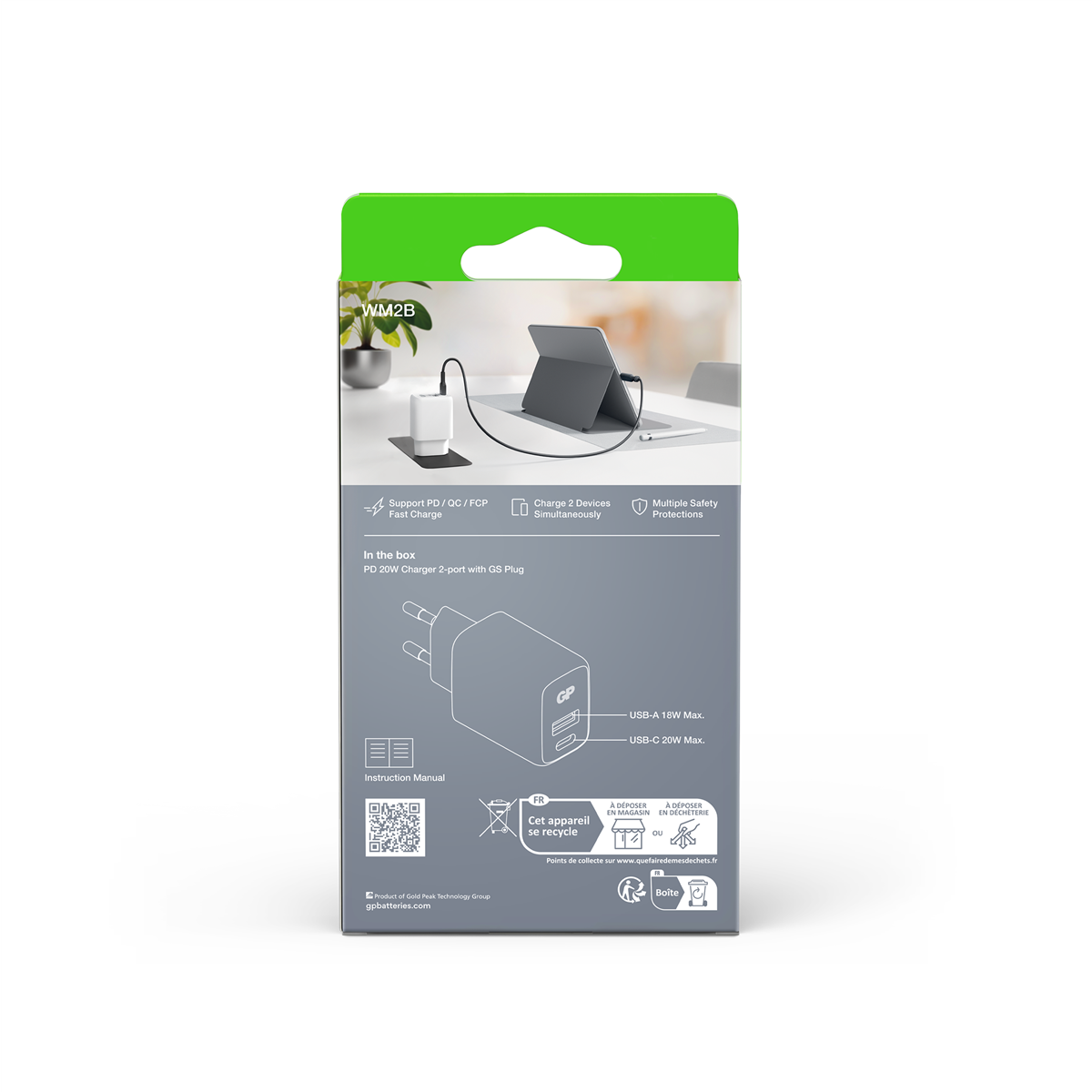 GP 20 W PD-laddare är kompatibel med PD 3.0/QC 3.0/FCP/AFC/DCP-snabbladdning. USB-C- och USB-A-portarna gör det möjligt att ladda två enheter samtidigt. De många säkerhetsfunktionerna förhindrar överspänning, överström och kortslutning. Den här laddaren har en förpackning helt av papper för att undvika plastföroreningar.