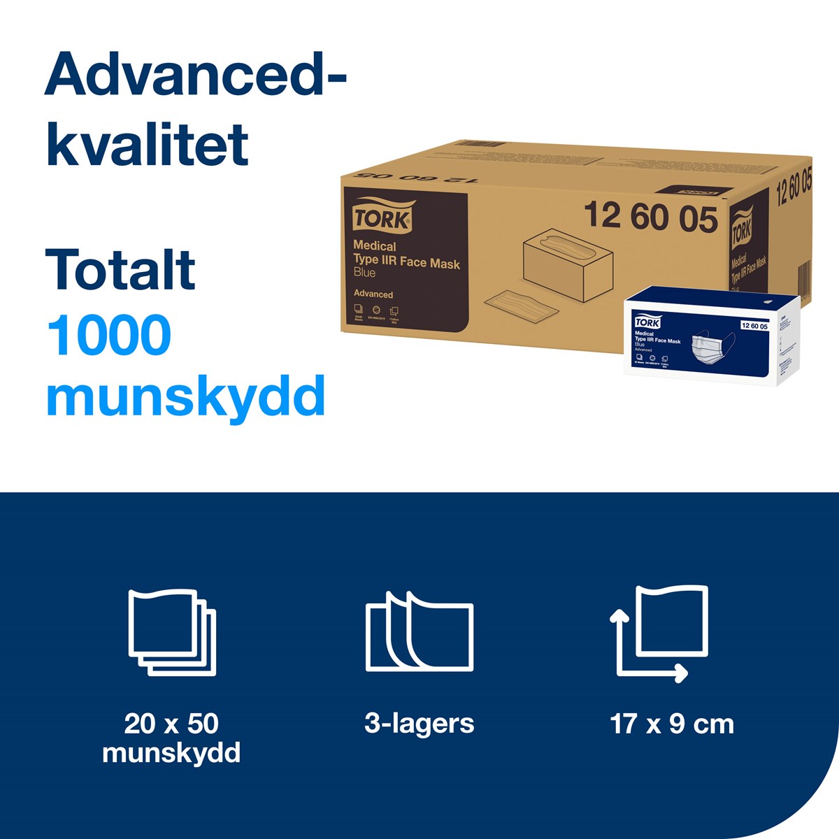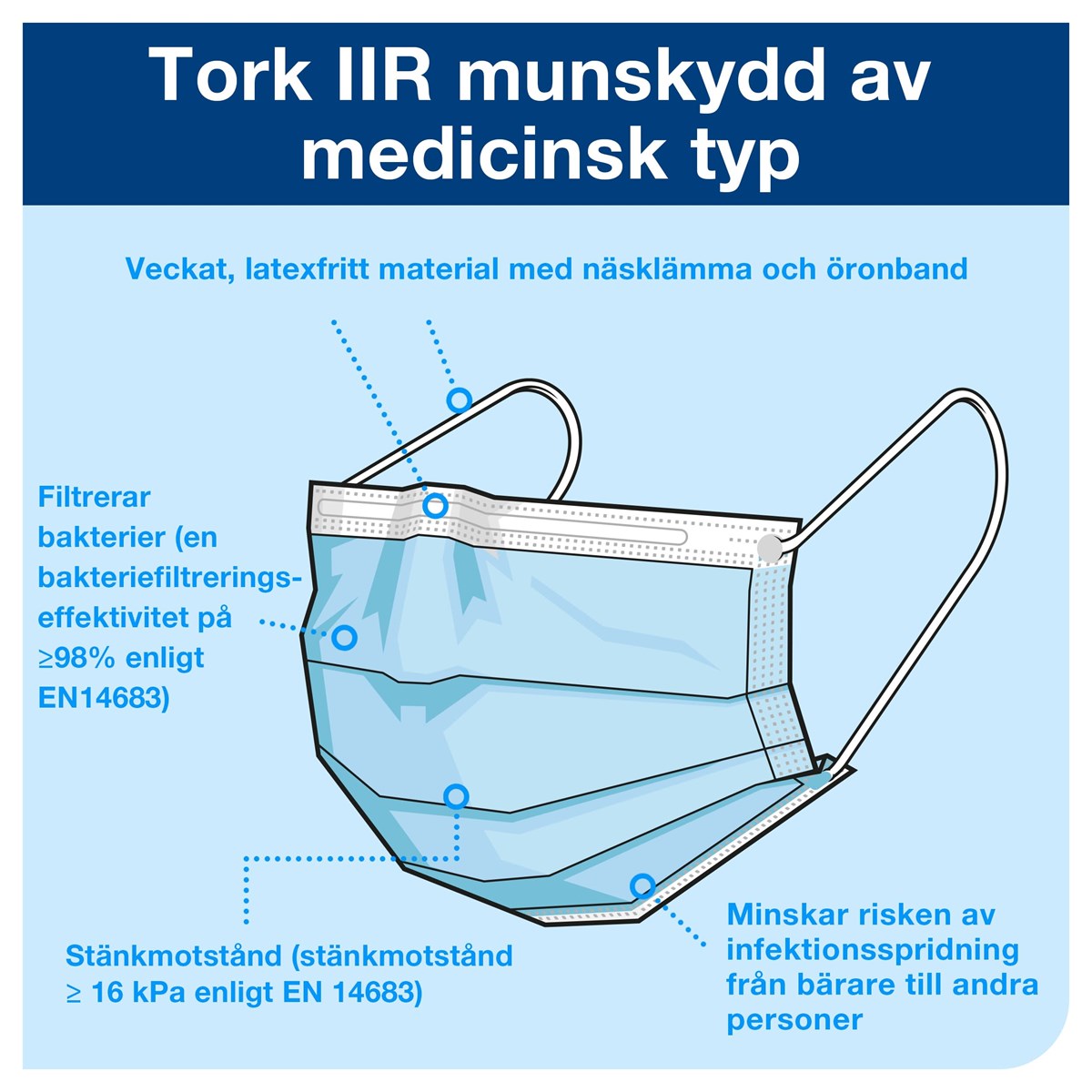 3-lagers blått munskydd som minskar risken för smittspridning och uppfyller EN 14683 standard (stänkskydd för 16kPa). Kan användas i miljöer där det finns risk för skvättande vätskor. CE-märkta. Fria från latex. Elastiska öronband. 50 st/förp.