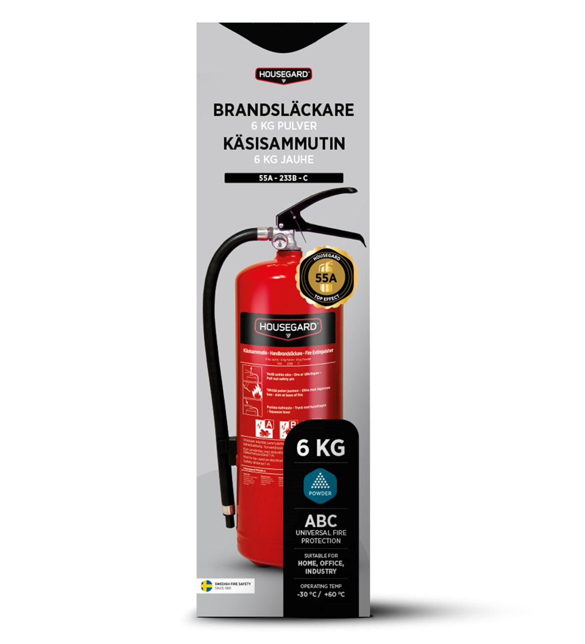 En 6 kilos pulversläckare släcker de flesta typer av bränder, i så gott som alla material. Släckaren har den högsta släckeffekten på marknaden för A och B-bränder, 55A 233B-C. Pulversläckaren kännetecknas av en hög släckeffekt och en god räckvidd för att kunna utföra släckning med ett säkert avstånd från branden. Klarar upp till 60 % större bränder än de flesta andra släckare på marknaden. Effektivitetsklass: 55A 233BC. Brandklass: A B C.
