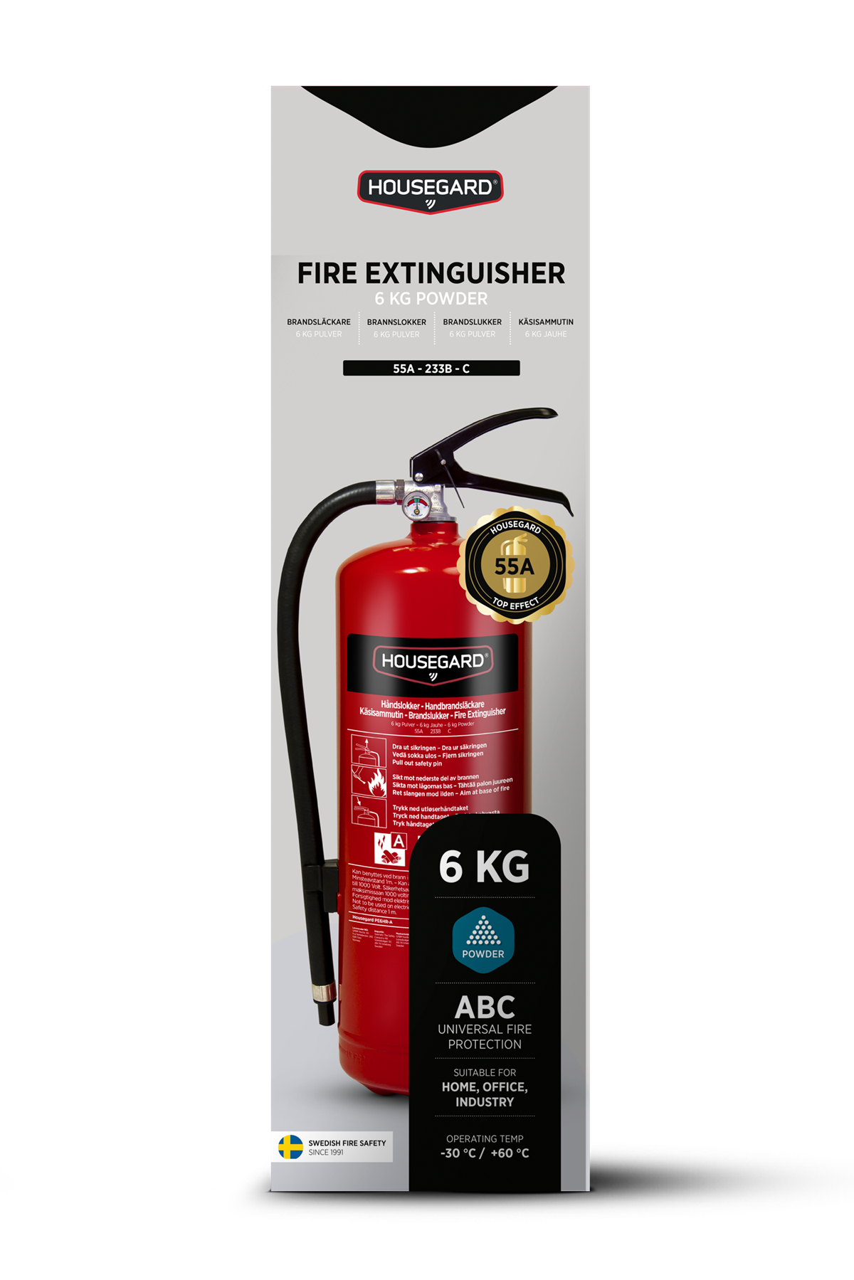 Det är skillnad på brandsläckare och brandsläckare, kompromissa inte med säkerheten. Ju högre släckeffekt en brandsläckare har desto större brand kan den släcka. Housegard 55A 6 kg pulver släcker de flesta typer av bränder, i så gott som alla material. Kompromissa inte med säkerheten, en dag kan brandsläckaren vara din viktigaste ägodel.