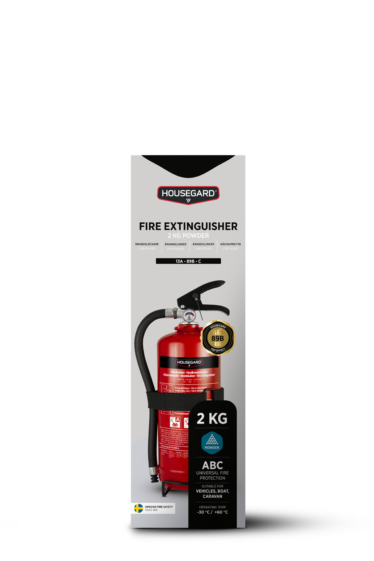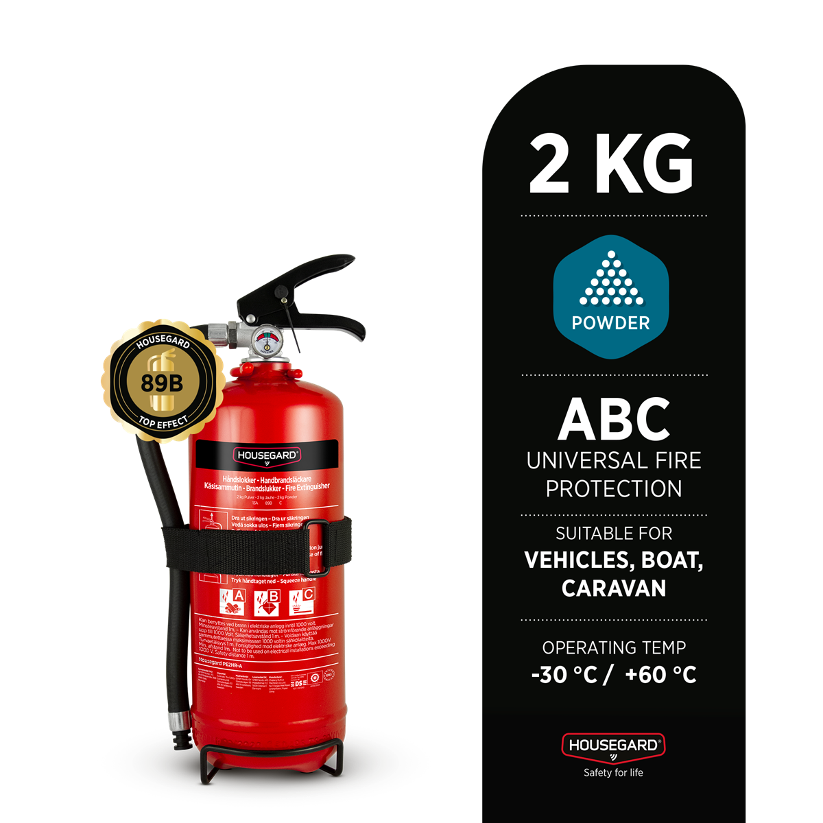 Med en 2 kg pulversläckare från Housegard i bilen kör du lite tryggare på vägen. Släckeffekten är på 13A 89B C vilket är den högsta på marknaden i storleksklassen vilket gör den väl anpassad för fordon som personbil, husvagn och fritidsbåt. Kan även användas som komplement till 6 kg pulversläckare i hemmet.